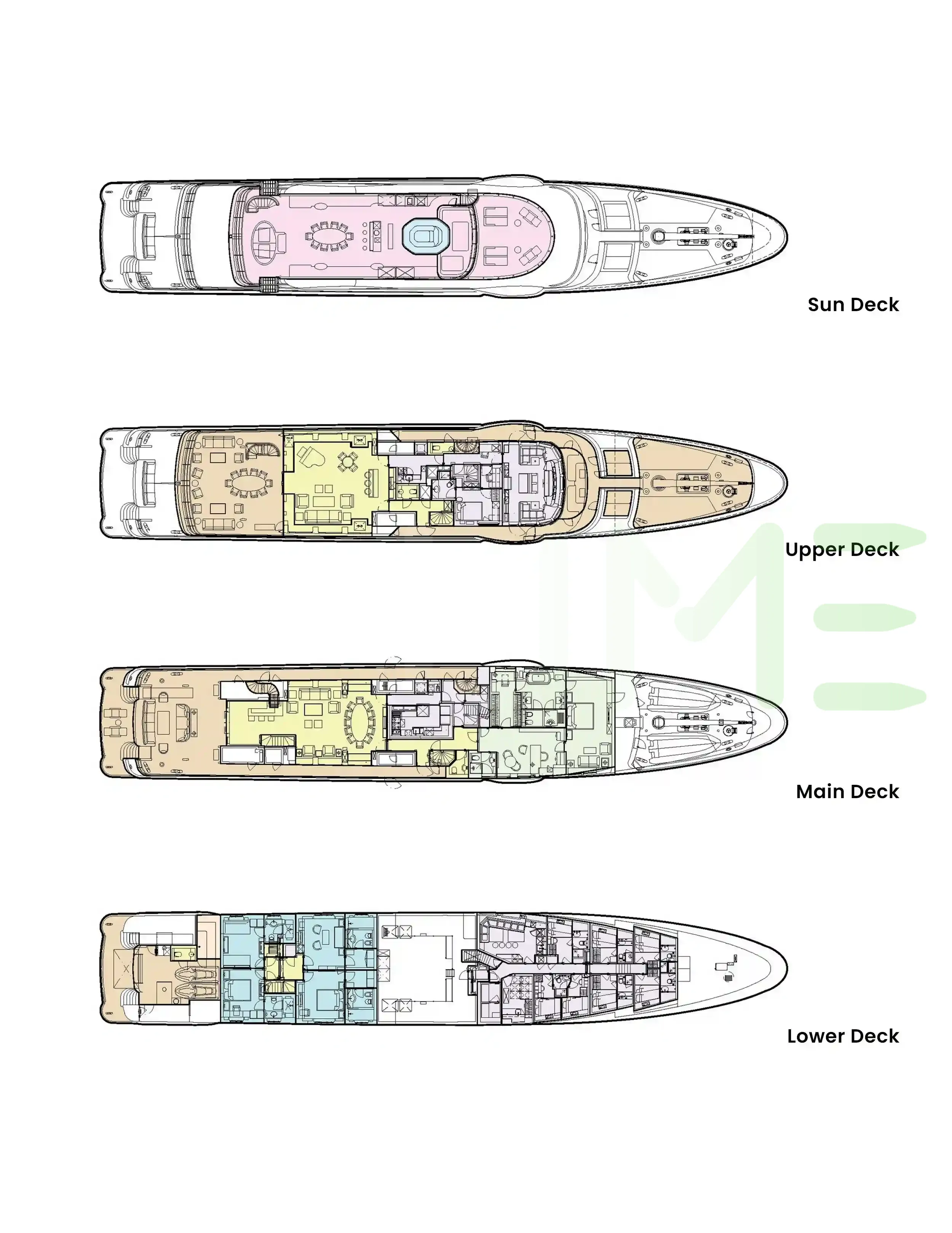 Request plans that include the layout of staterooms, guest areas, and outdoor spaces, as well as crew quarters and work areas.