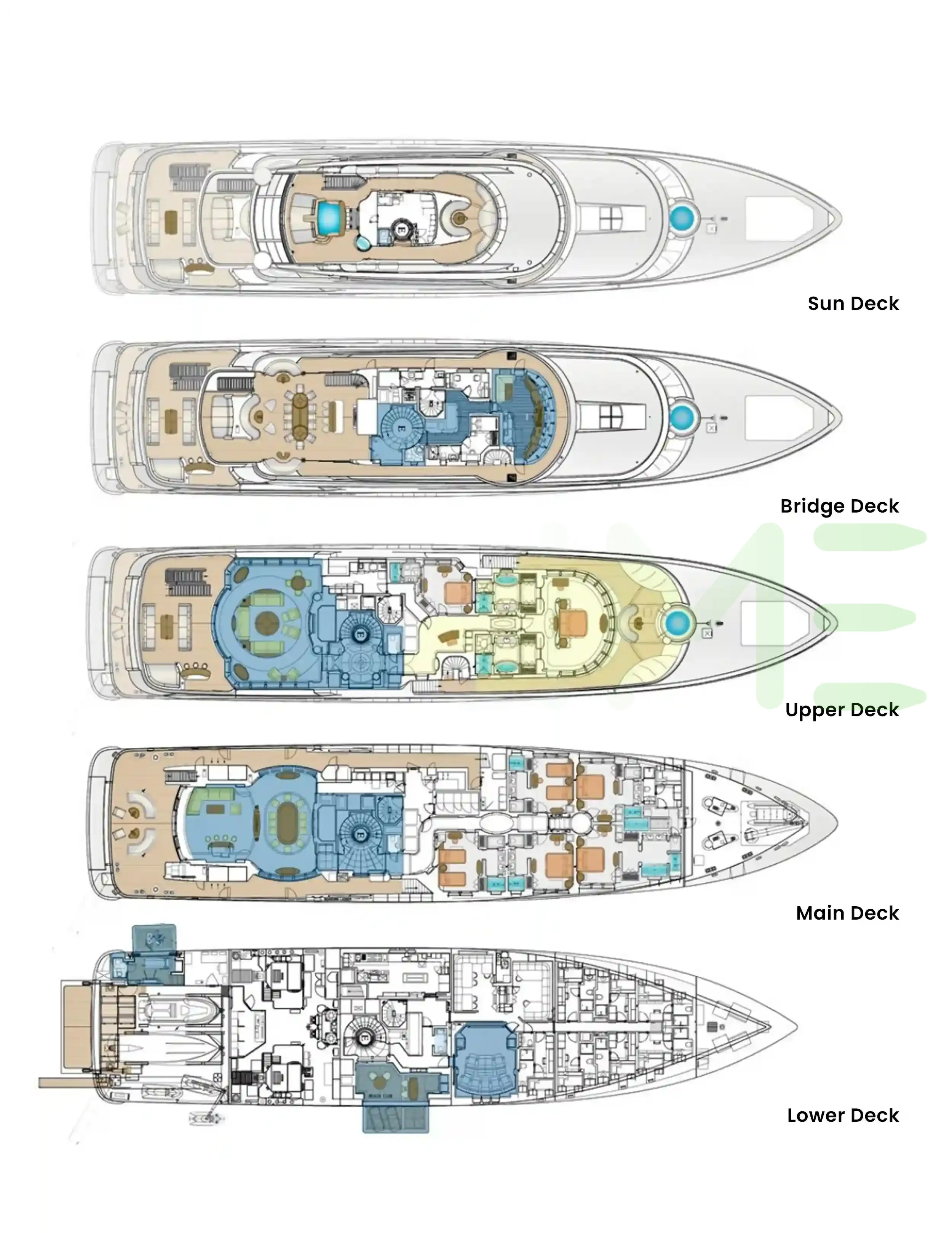 Request plans that include the layout of staterooms, guest areas, and outdoor spaces, as well as crew quarters and work areas.
