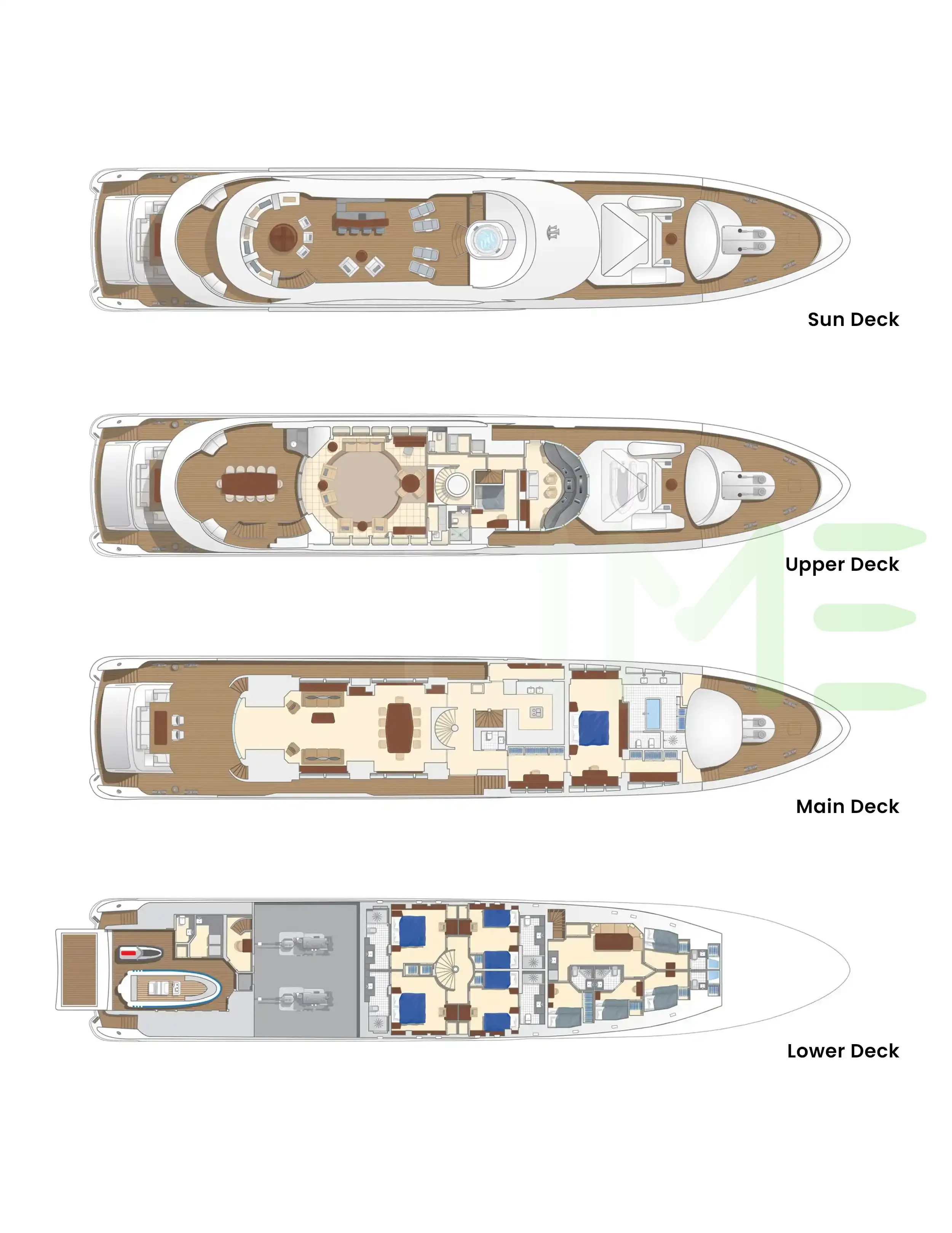 Request plans that include the layout of staterooms, guest areas, and outdoor spaces, as well as crew quarters and work areas.