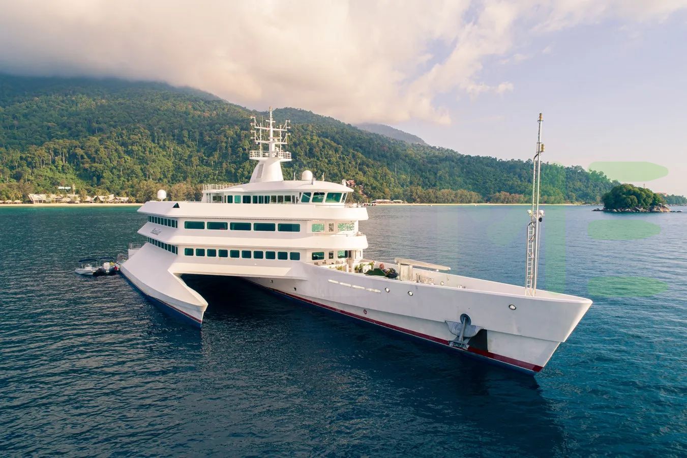ASEAN LADY is a full-displacement oceangoing catamaran motoryacht, with a beam of 69' 7" (21.2 meters), offering stability and comfort during blue water open ocean navigation, including near coastal and inland cruising. Her full-displacement hull shape and draft of 11' 6" (3.5 meters) further contribute to a yacht with a longer range, stowage, and a smooth sailing experience, making her ideal for extended journeys and global travel.