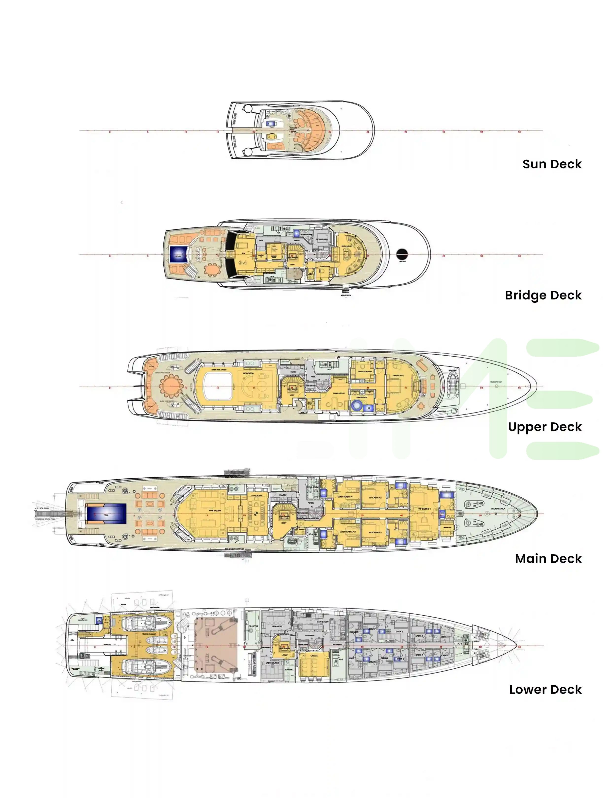 Request plans that include the layout of staterooms, guest areas, and outdoor spaces, as well as crew quarters and work areas.