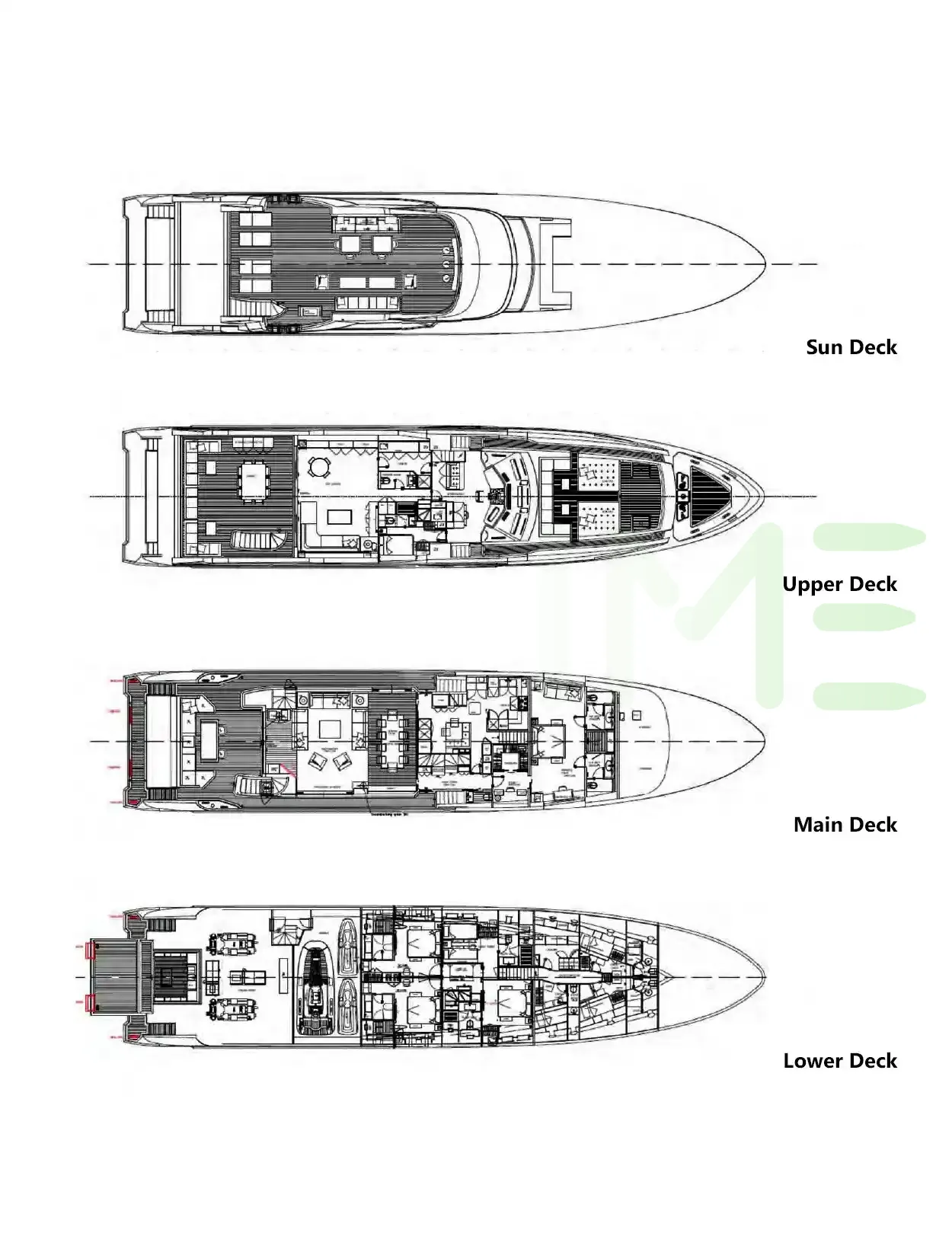 Request plans that include the layout of staterooms, guest areas, and outdoor spaces, as well as crew quarters and work areas.