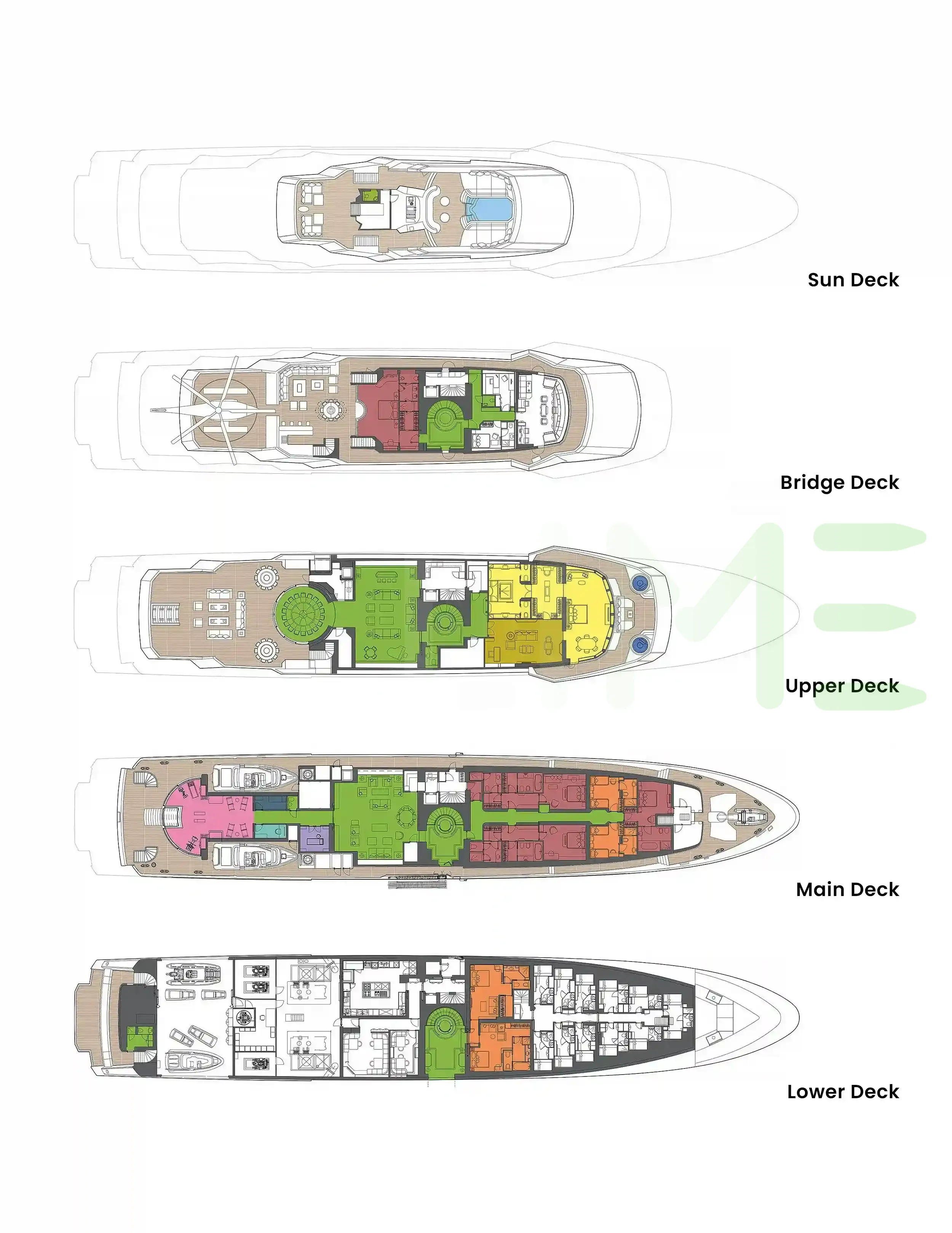 Request plans that include the layout of staterooms, guest areas, and outdoor spaces, as well as crew quarters and work areas.