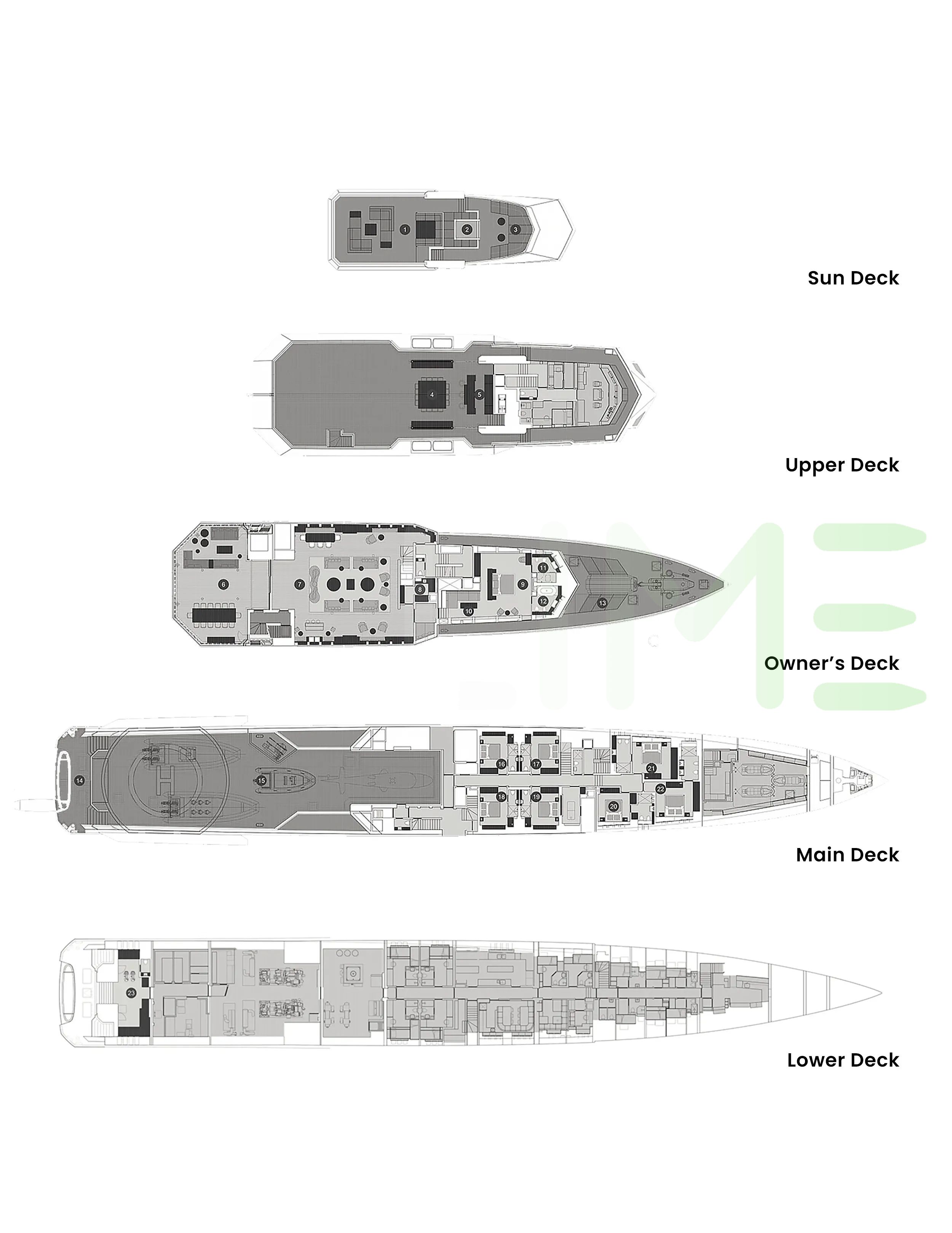 Request plans that include the layout of staterooms, guest areas, and outdoor spaces, as well as crew quarters and work areas.