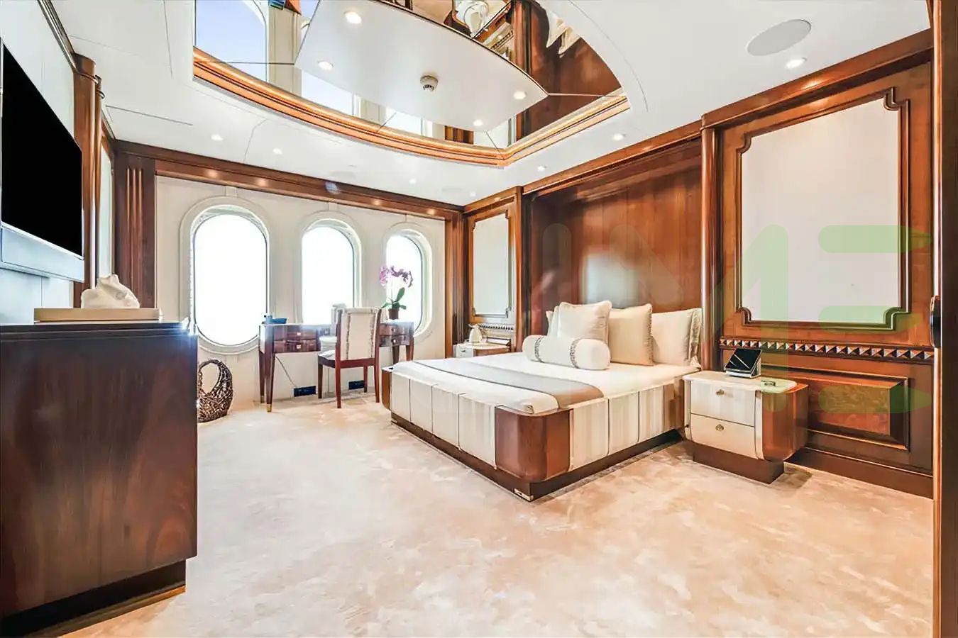 Enhanced by her steel full-displacement hull, and aluminium superstructure, a higher level of seaworthiness and comfort for those on board the CALYPSO yacht for sale has been achieved. The visual appeal of the exterior is complimented by the rich color and distinctive grain patterns of teak decks that lend an air of sophistication to the yacht's appearance.