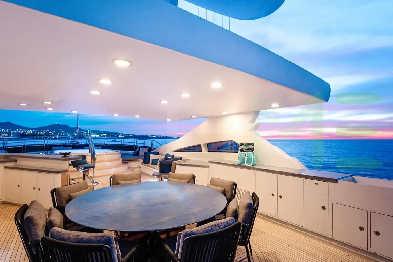 CHAMPAGNE SEAS is a semi-displacement mono-hull luxury motoryacht, with a beam of 33' 6" (10.2 meters), offering stability and comfort during near coastal and inland cruising. The semi-displacement hull shape and draft of 7' 10" (2.4 meters) further enhances her speed, allowing quick sprints from port to port, making her ideal for visiting the maximum number of destinations on your itinerary in the shortest period.