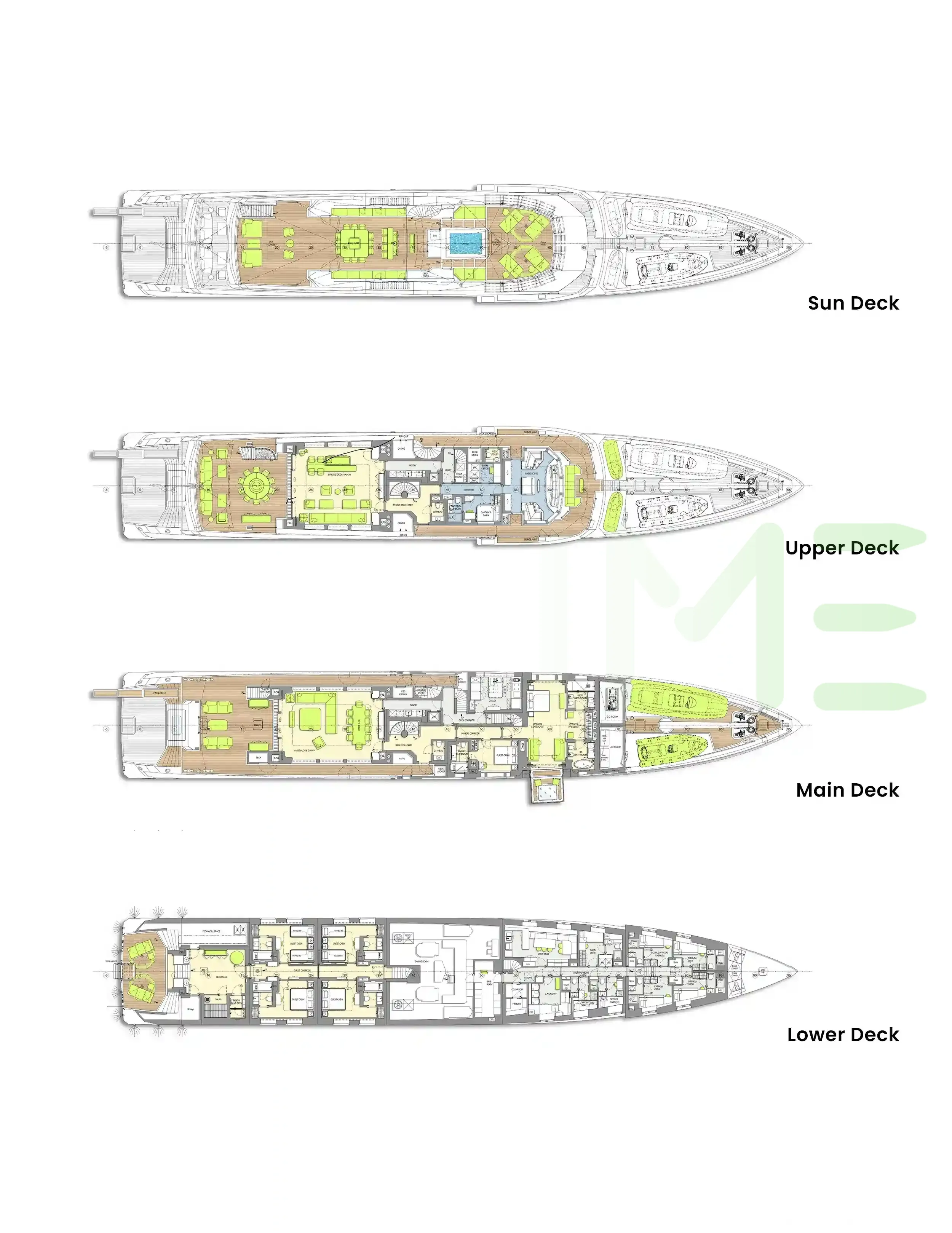 Request plans that include the layout of staterooms, guest areas, and outdoor spaces, as well as crew quarters and work areas.