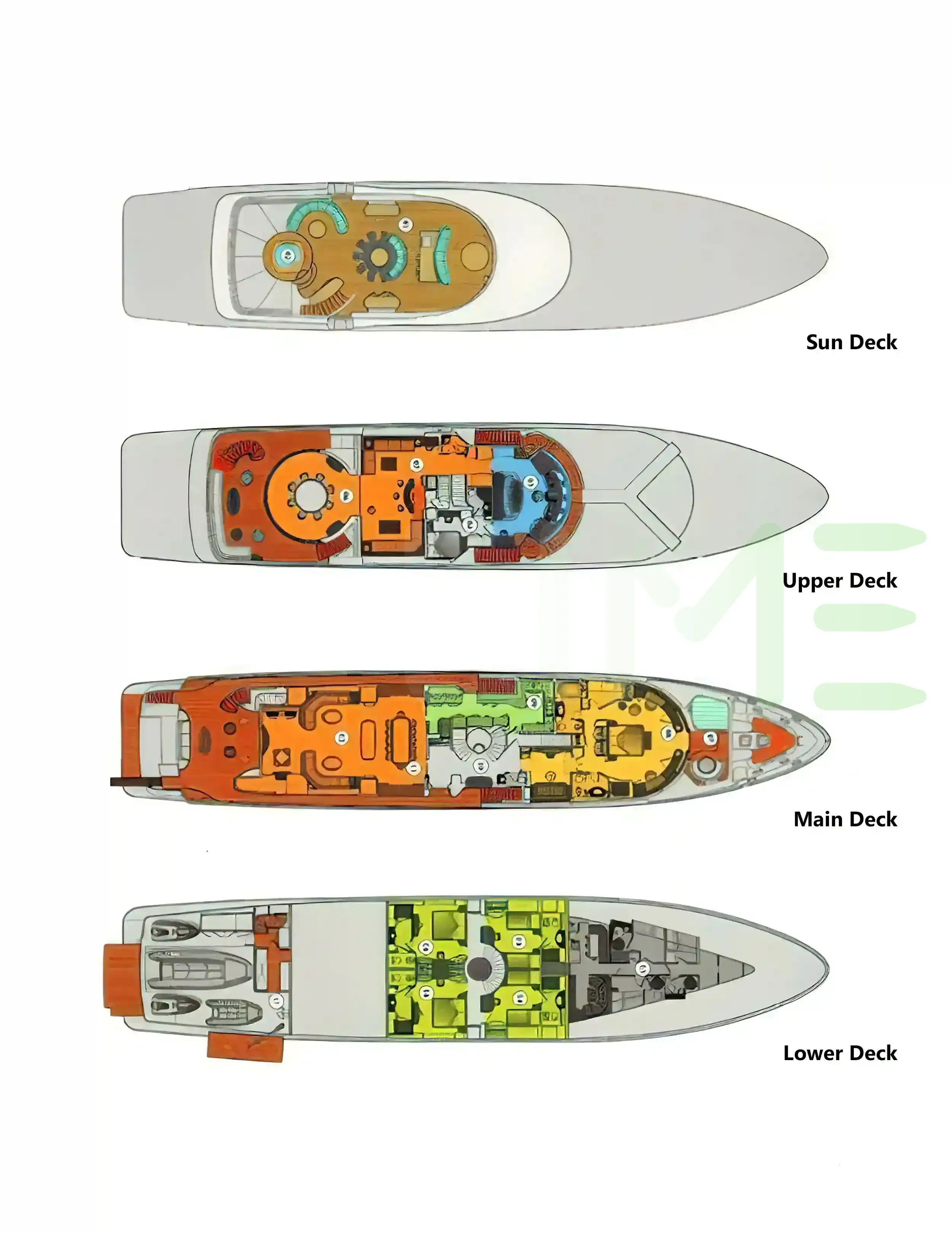 Request plans that include the layout of staterooms, guest areas, and outdoor spaces, as well as crew quarters and work areas.