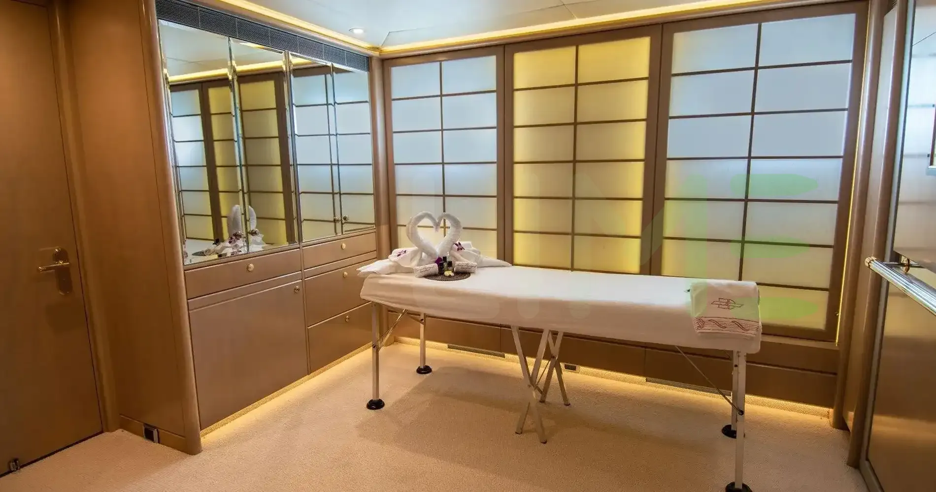 Her features include a spa, sauna, deck jacuzzi, WiFi and air conditioning.