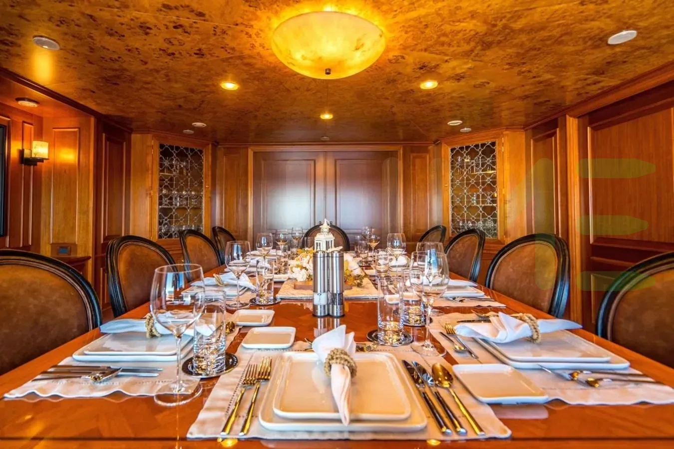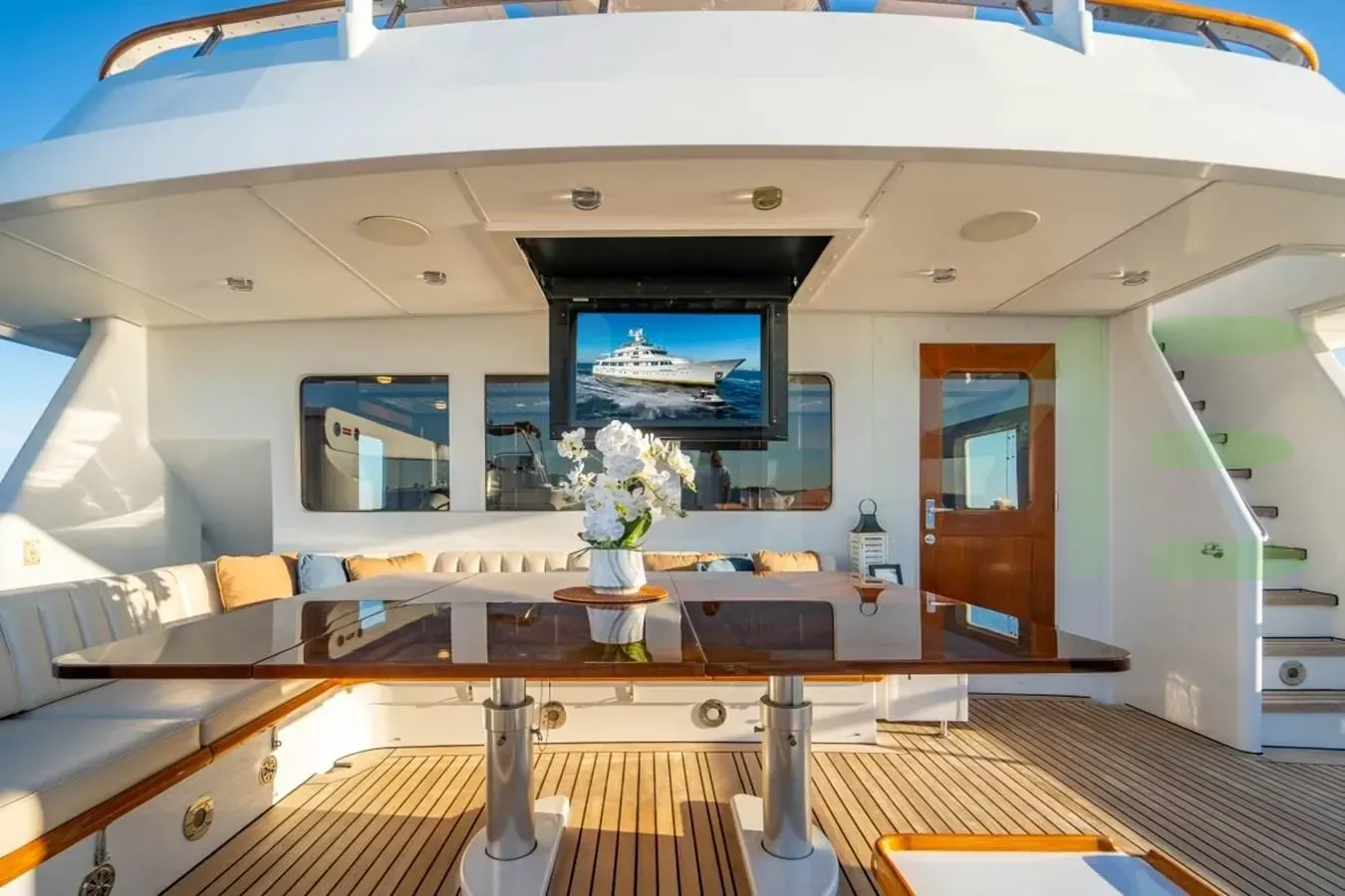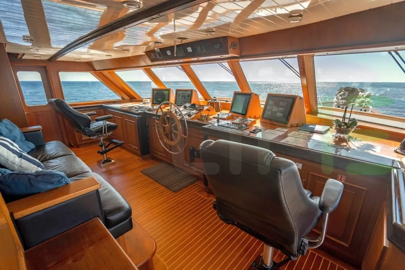 DRAMA QUEEN is a full-displacement oceangoing mono-hull motoryacht, with a beam of 29' (8.85 meters), offering stability and comfort during blue water open ocean navigation, including near coastal and inland cruising. Her full-displacement hull shape and draft of 8' 11" (2.72 meters) further contribute to a yacht with a longer range, stowage, and a smooth sailing experience, making her ideal for extended journeys and global travel.