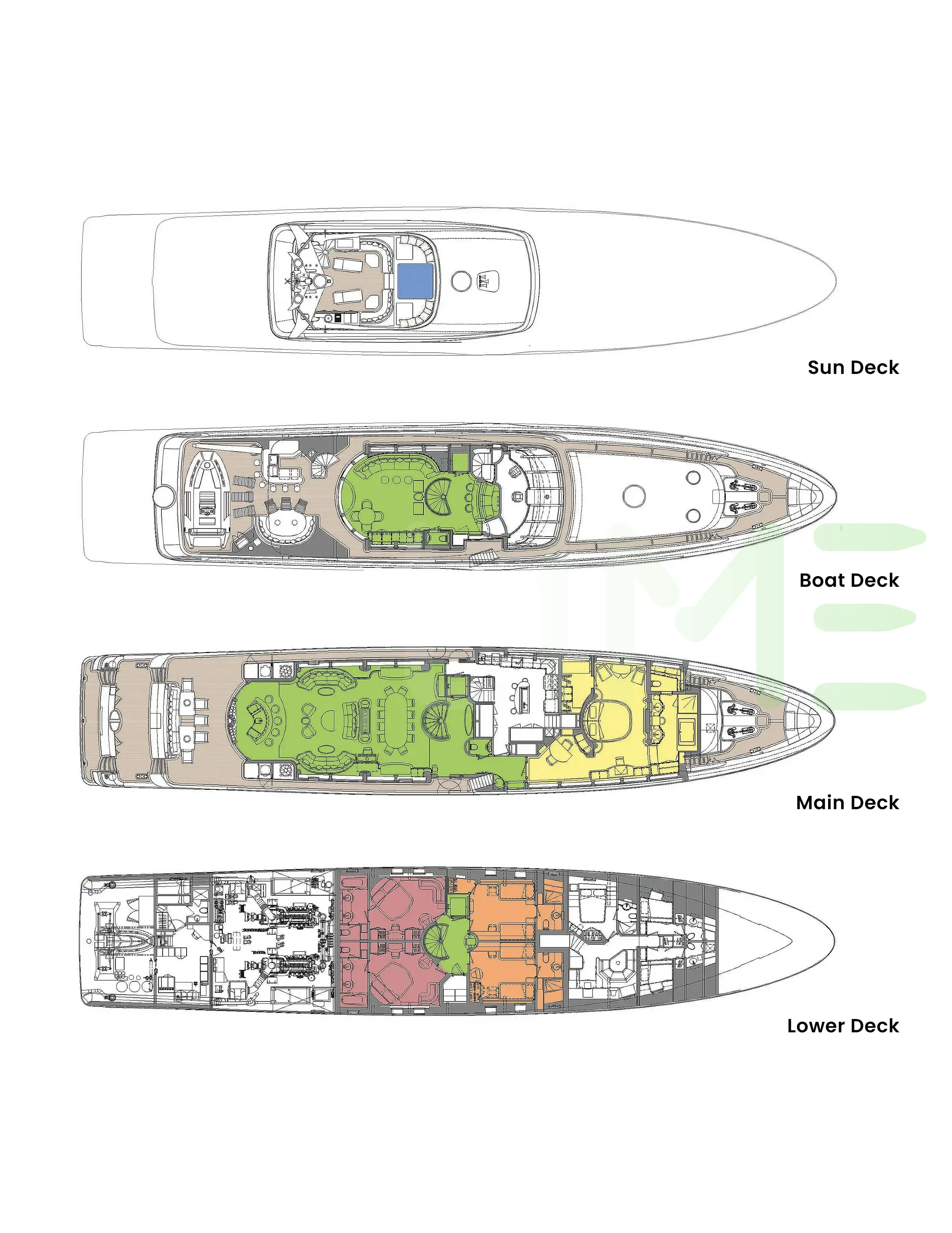 Request plans that include the layout of staterooms, guest areas, and outdoor spaces, as well as crew quarters and work areas.