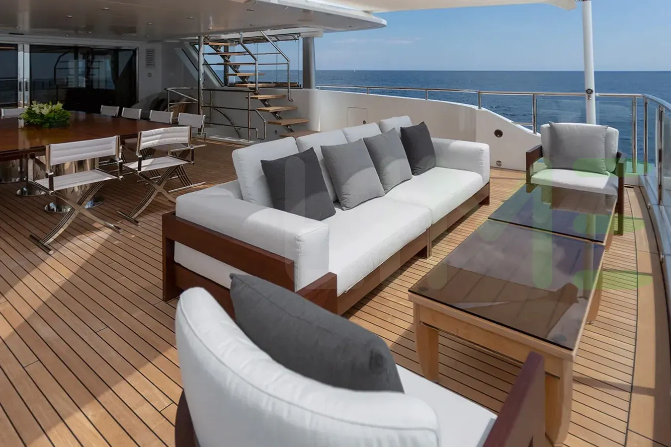 Enhanced by her steel full-displacement hull, and aluminium superstructure, a higher level of seaworthiness and comfort for those on board the E.MOTION+ yacht has been achieved. The visual appeal of the exterior is complimented by the rich color and distinctive grain patterns of teak decks that lend an air of sophistication to the yacht's appearance.