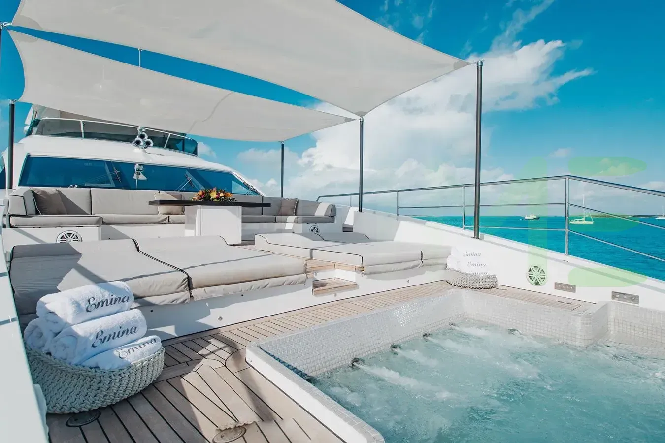 You and your guests can enjoy a variety of experiences on Emina, notably the pool, useful to practice your technique or just cool off. Even the most discerning of charter guests will enjoy the included beach club or a gym with all the latest equipment is available for a good work out. Soak up the bubbles in style in the deck jacuzzi.