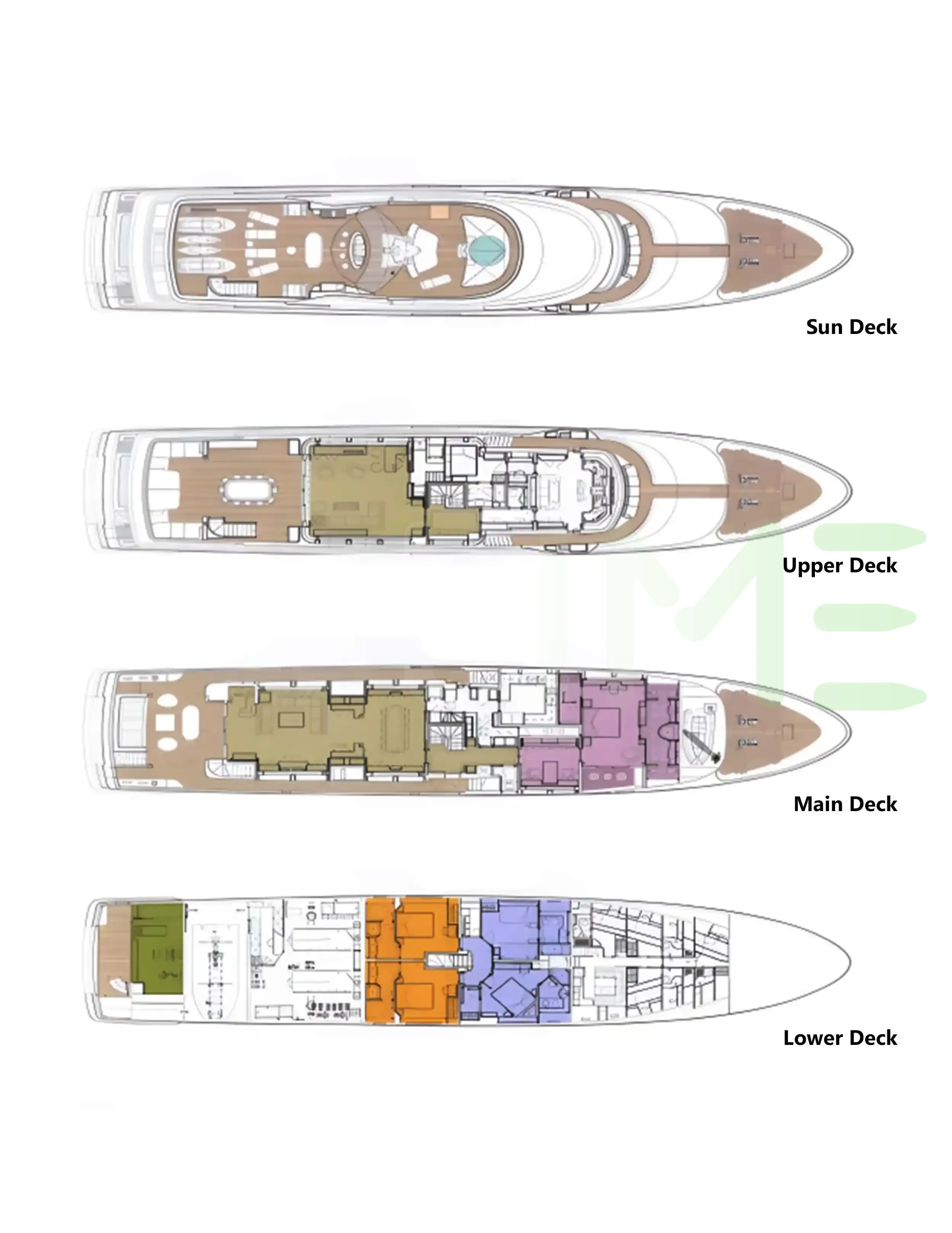 Request plans that include the layout of staterooms, guest areas, and outdoor spaces, as well as crew quarters and work areas.