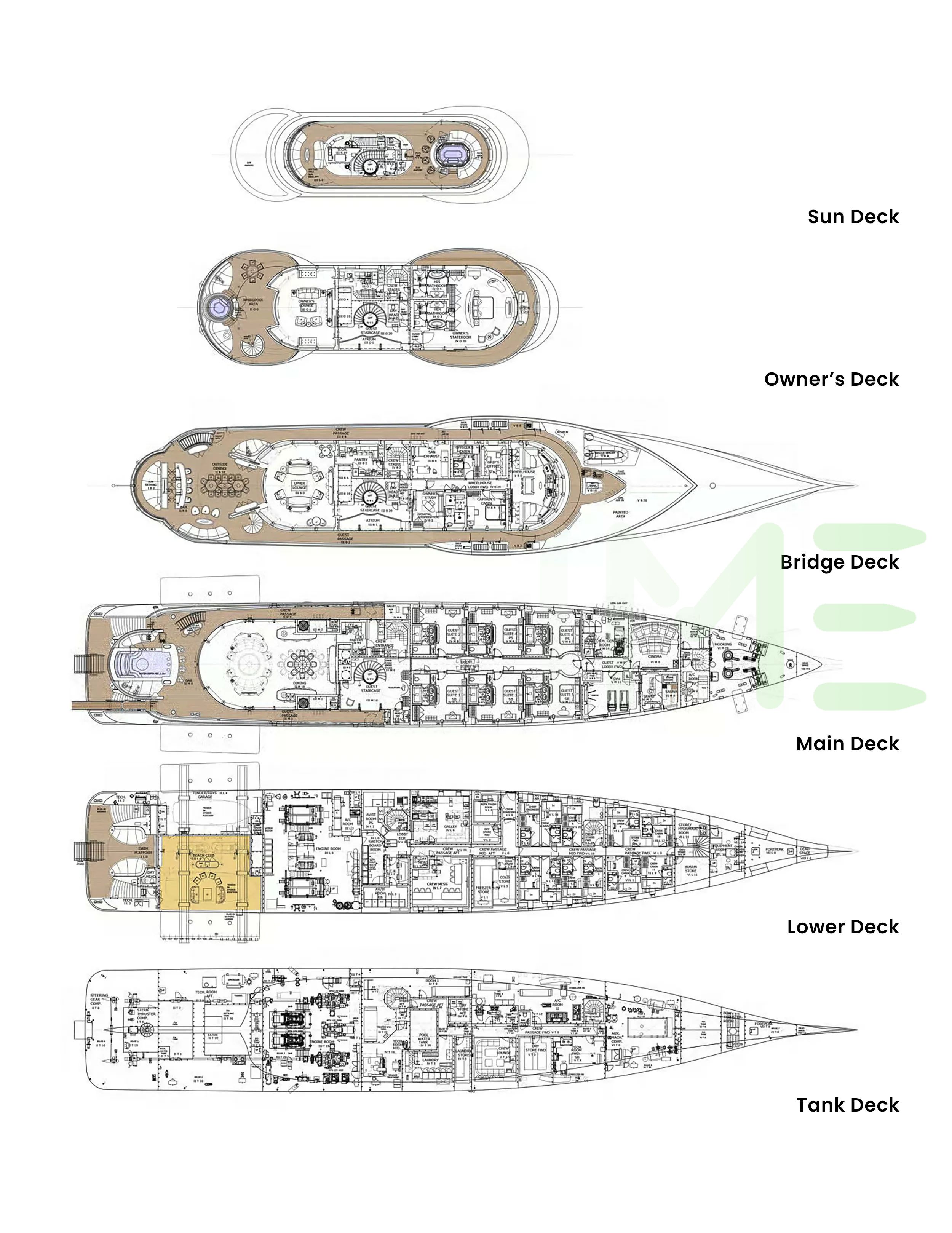Request plans that include the layout of staterooms, guest areas, and outdoor spaces, as well as crew quarters and work areas.