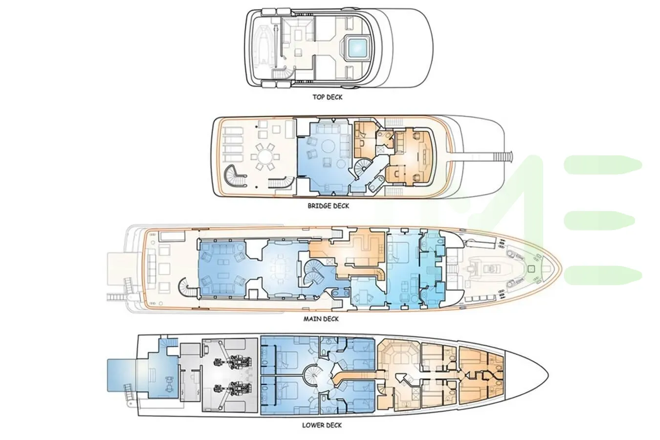 Request plans that include the layout of staterooms, guest areas, and outdoor spaces, as well as crew quarters and work areas.
