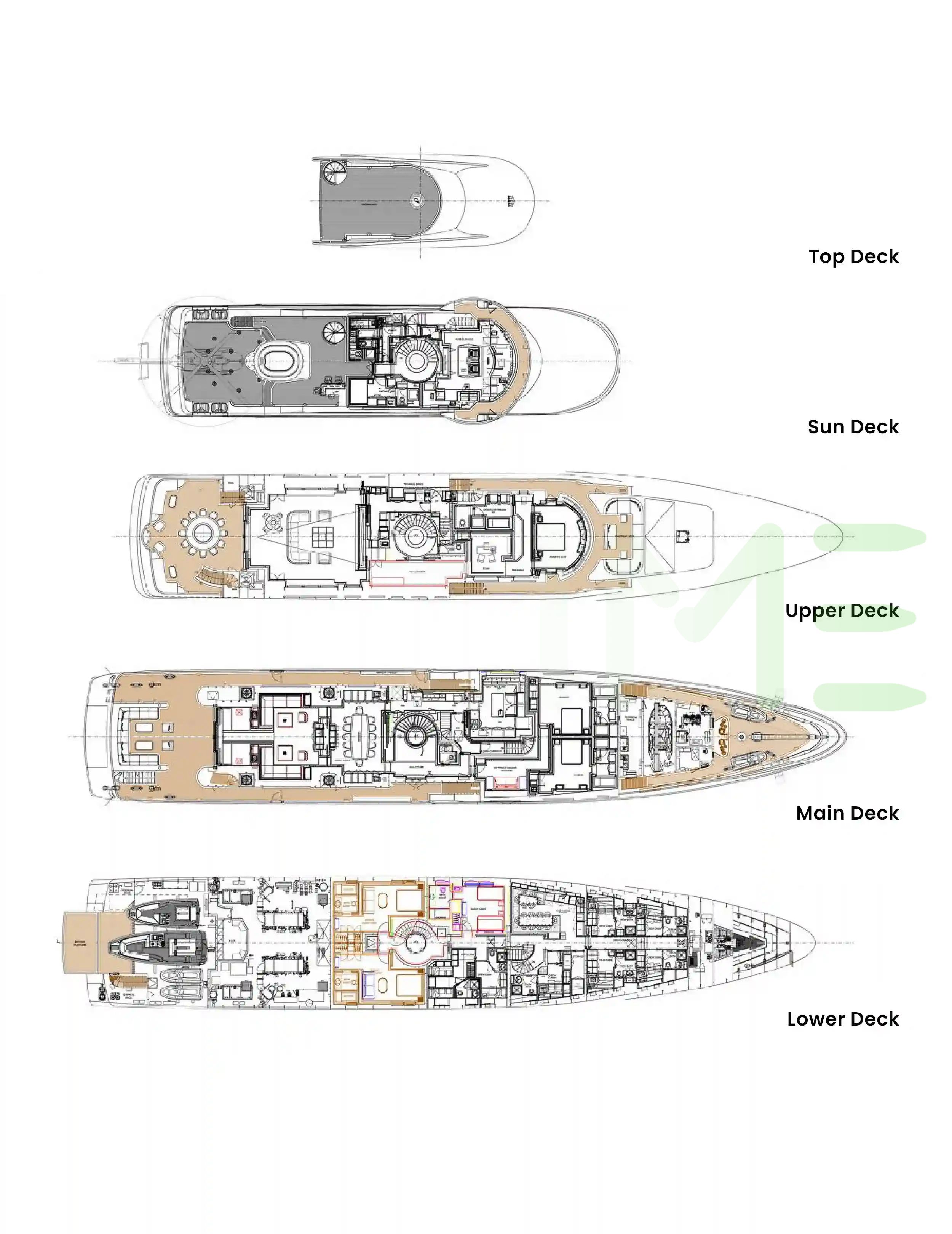 Request plans that include the layout of staterooms, guest areas, and outdoor spaces, as well as crew quarters and work areas.