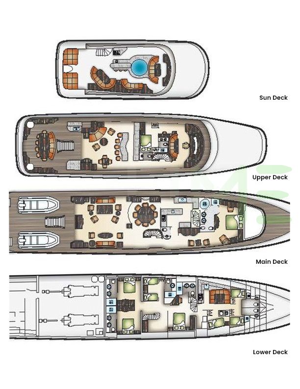 Request plans that include the layout of staterooms, guest areas, and outdoor spaces, as well as crew quarters and work areas.