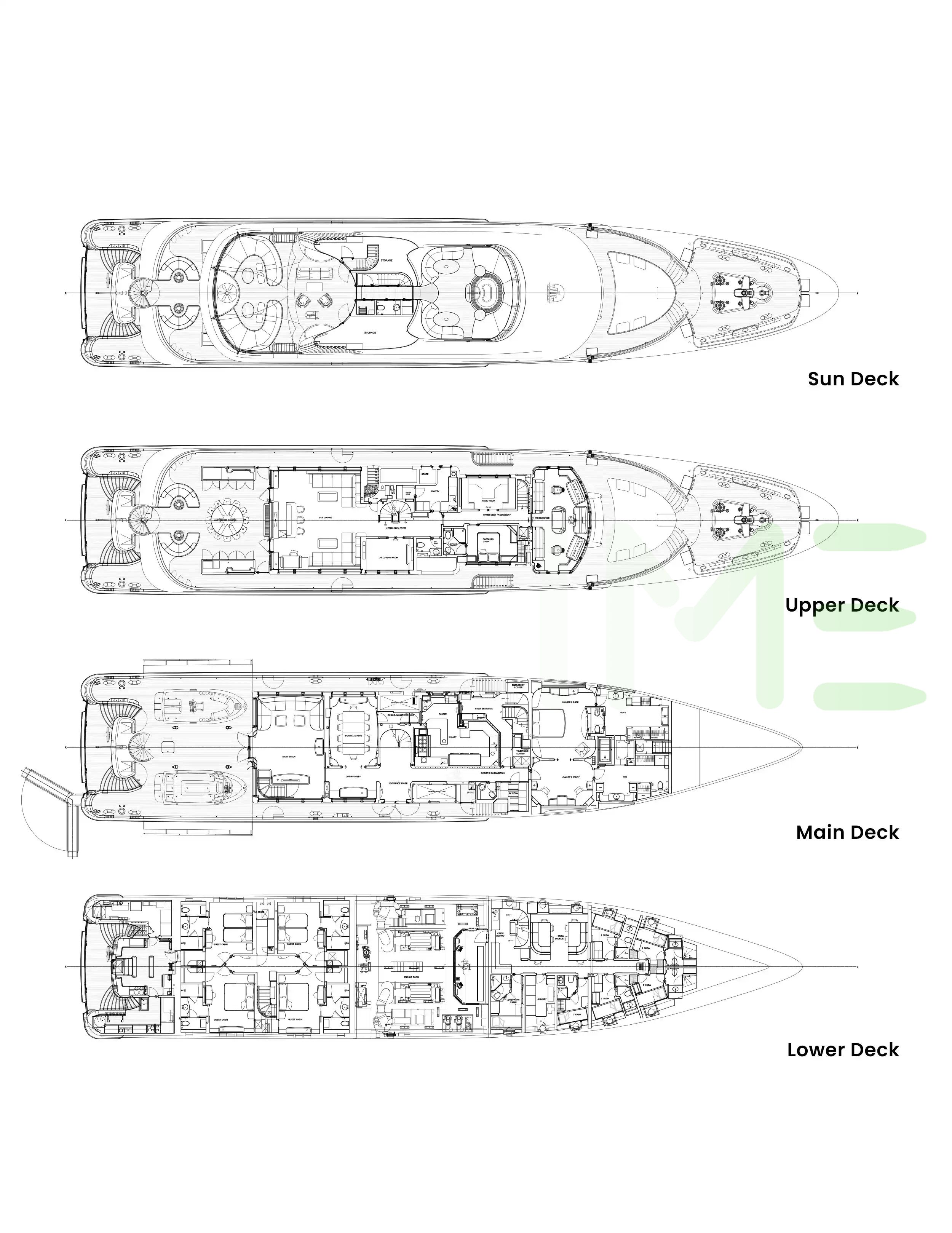 Request plans that include the layout of staterooms, guest areas, and outdoor spaces, as well as crew quarters and work areas.