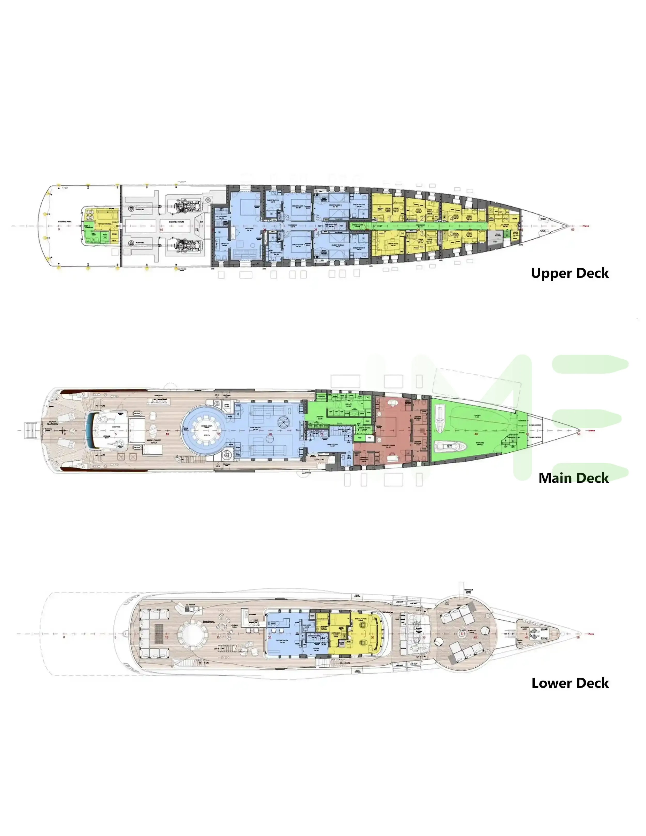 Request plans that include the layout of staterooms, guest areas, and outdoor spaces, as well as crew quarters and work areas.