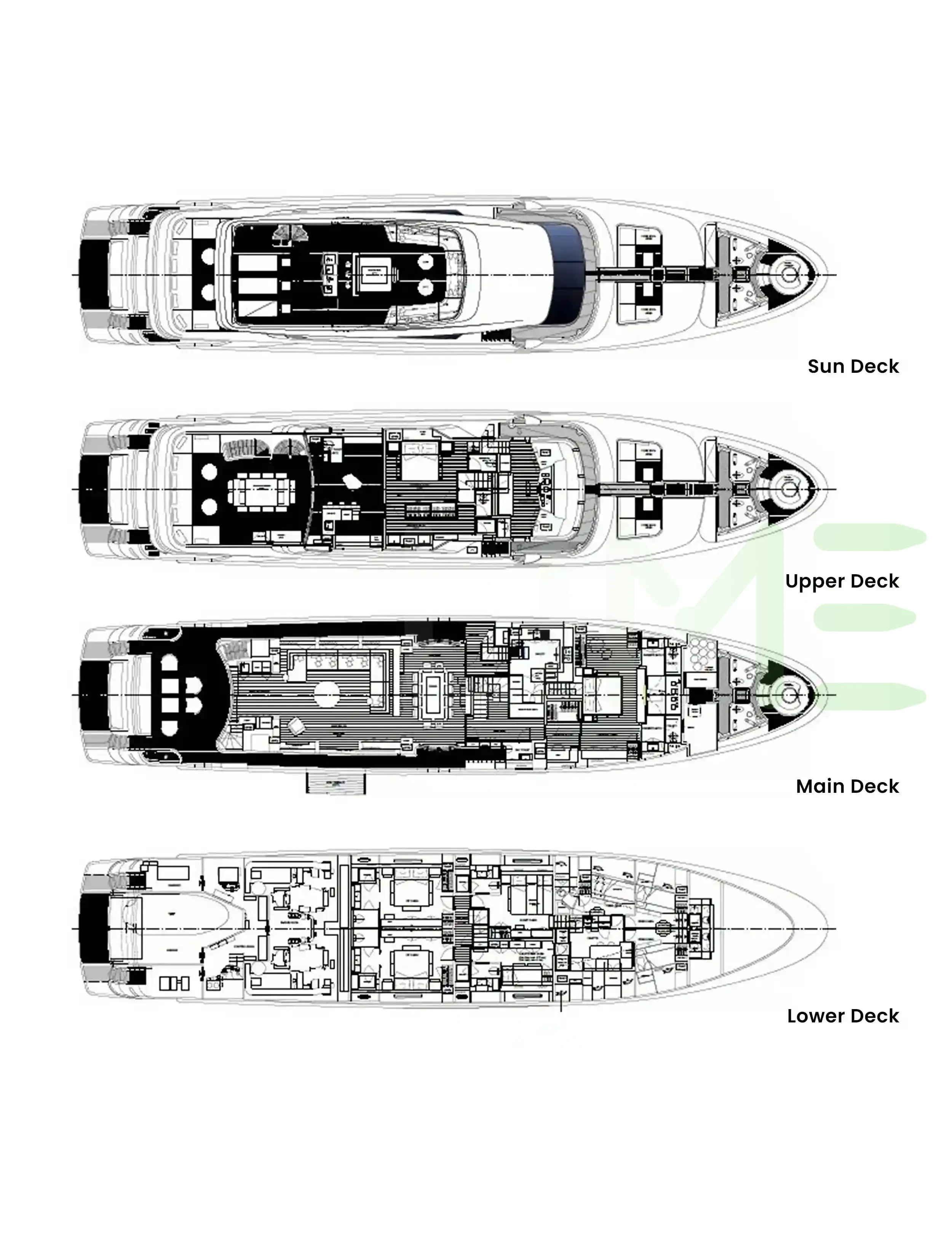 Request plans that include the layout of staterooms, guest areas, and outdoor spaces, as well as crew quarters and work areas.