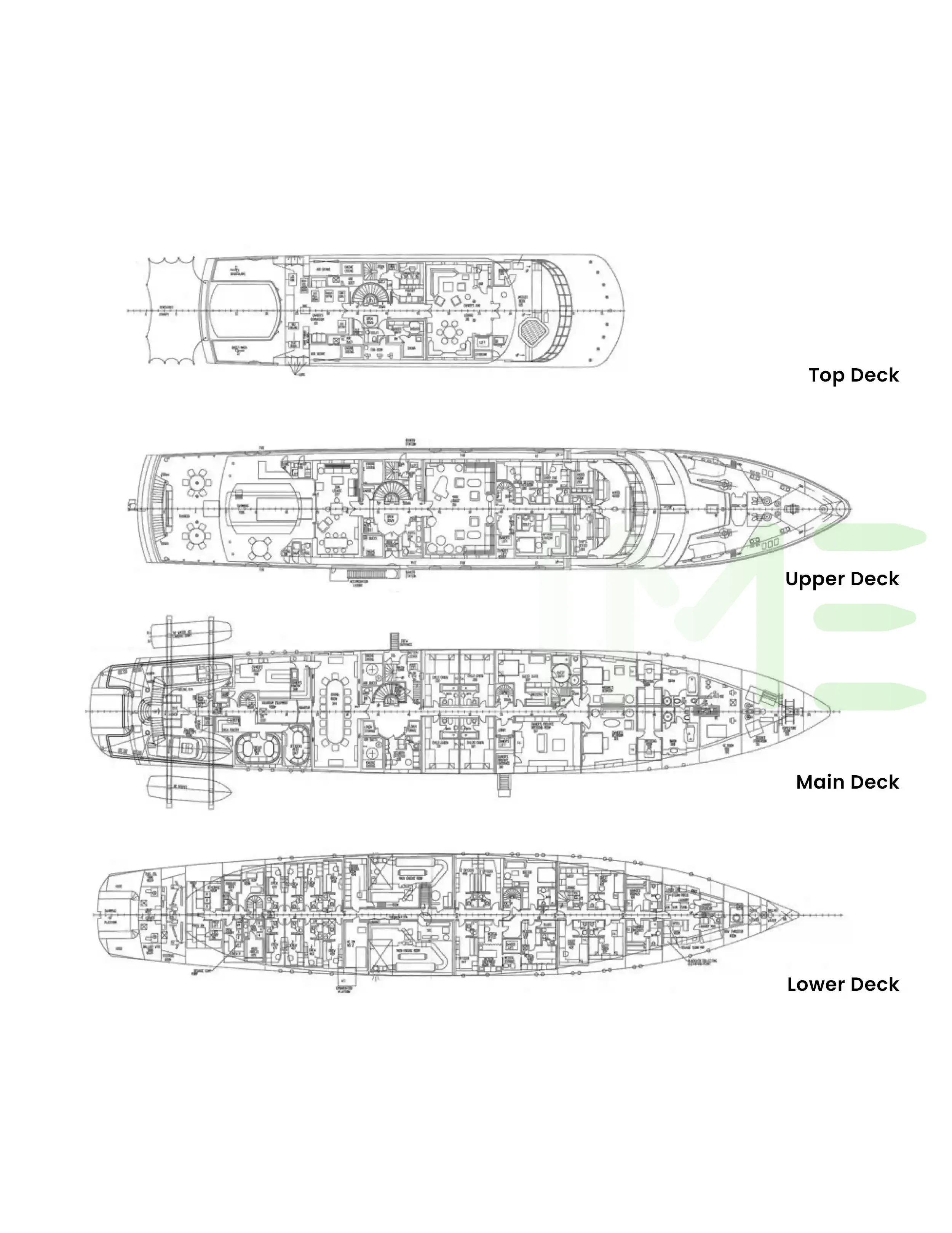 Request plans that include the layout of staterooms, guest areas, and outdoor spaces, as well as crew quarters and work areas.