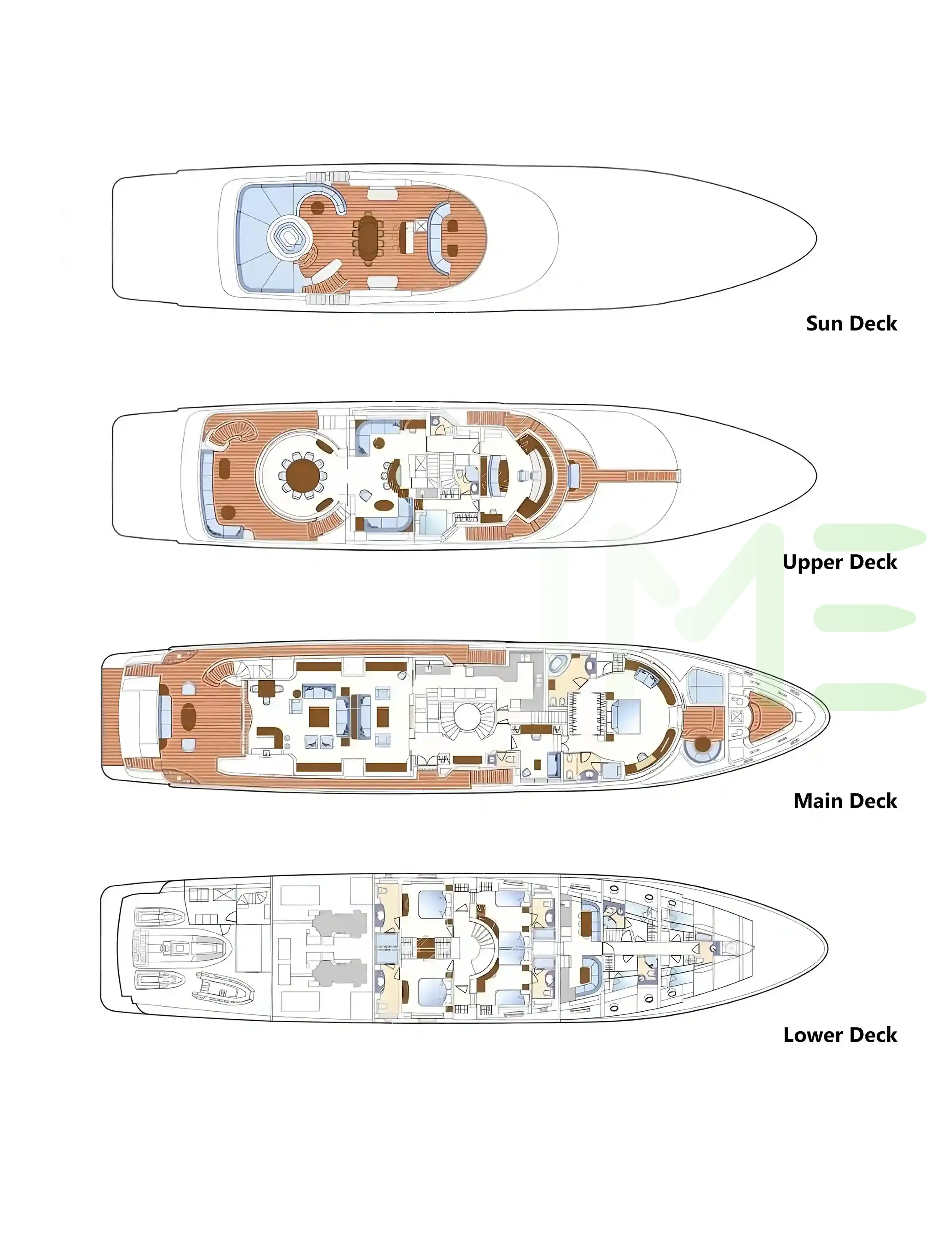 Request plans that include the layout of staterooms, guest areas, and outdoor spaces, as well as crew quarters and work areas.