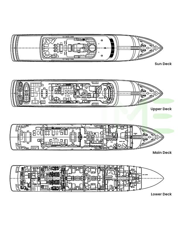 Request plans that include the layout of staterooms, guest areas, and outdoor spaces, as well as crew quarters and work areas.