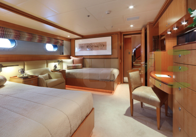 Her features include separate crew passageway, deck jacuzzi, WiFi and air conditioning.