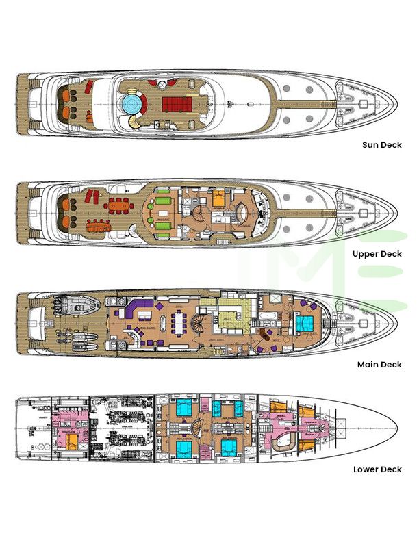 Request plans that include the layout of staterooms, guest areas, and outdoor spaces, as well as crew quarters and work areas.