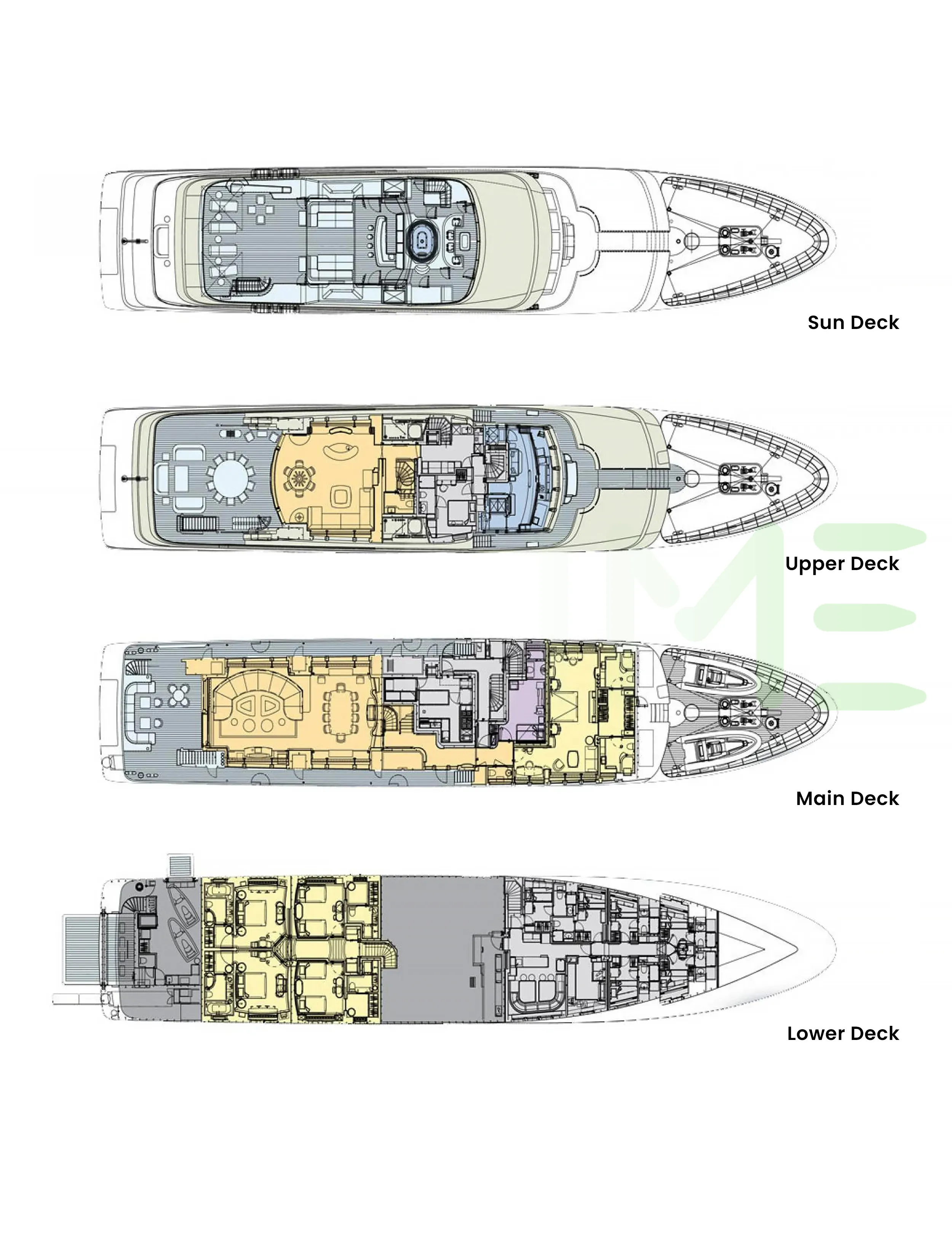 Request plans that include the layout of staterooms, guest areas, and outdoor spaces, as well as crew quarters and work areas.