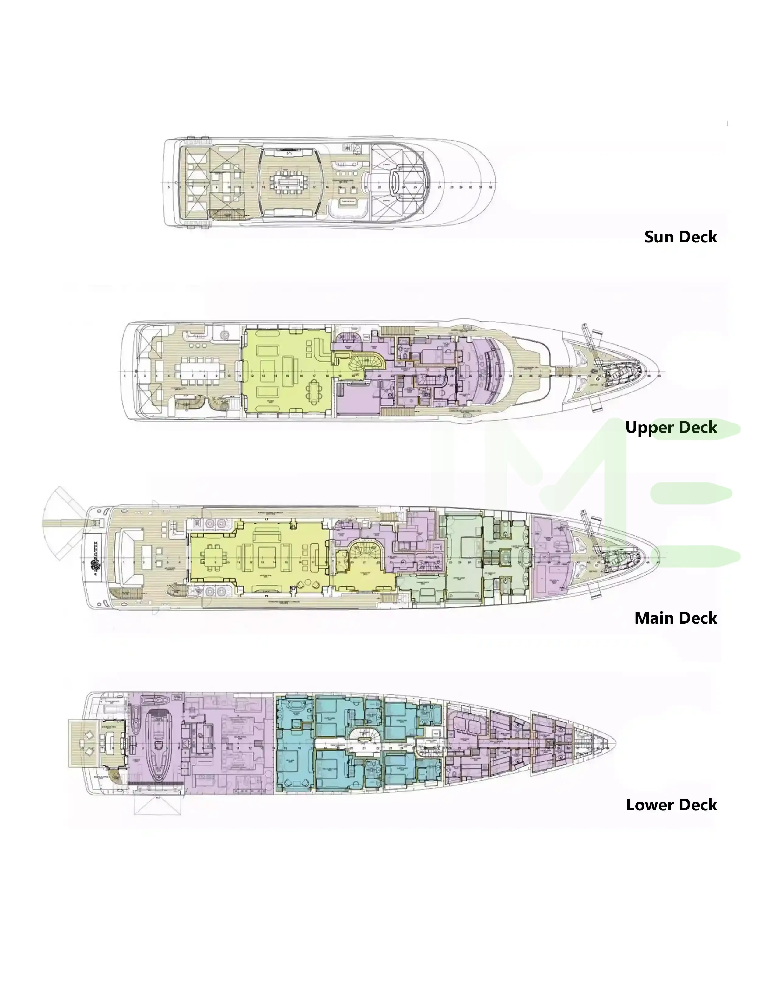Request plans that include the layout of staterooms, guest areas, and outdoor spaces, as well as crew quarters and work areas.