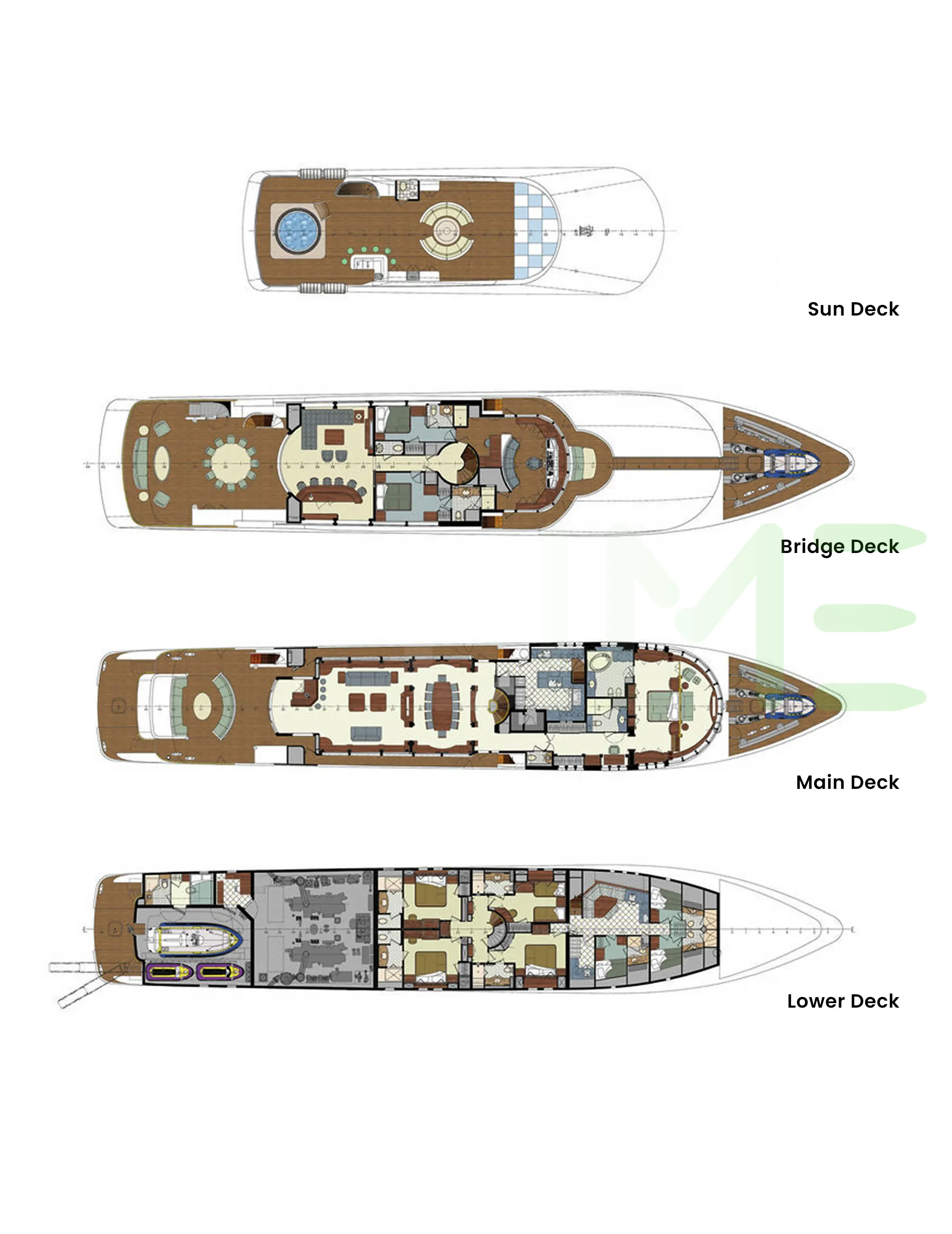 Request plans that include the layout of staterooms, guest areas, and outdoor spaces, as well as crew quarters and work areas.