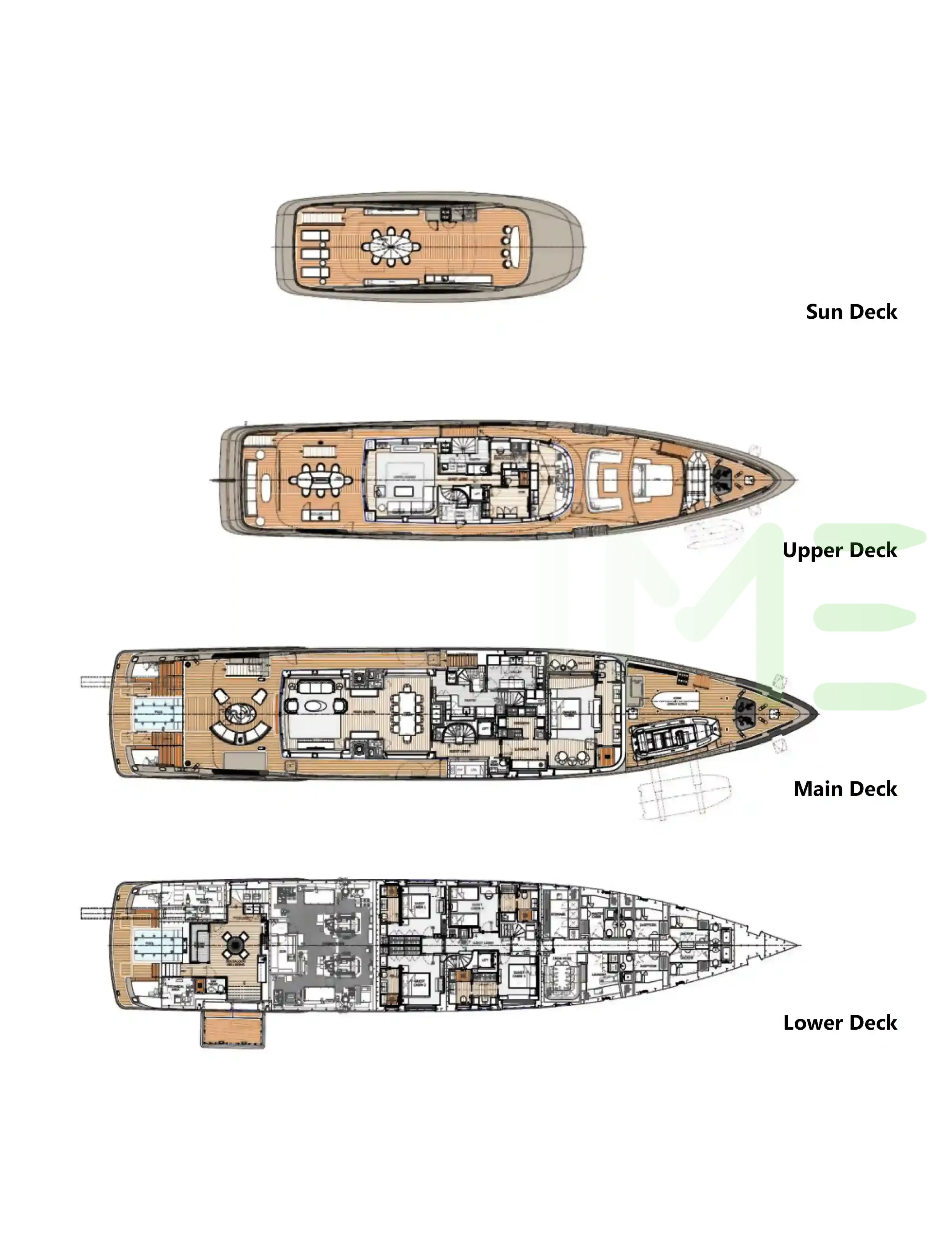 Request plans that include the layout of staterooms, guest areas, and outdoor spaces, as well as crew quarters and work areas.