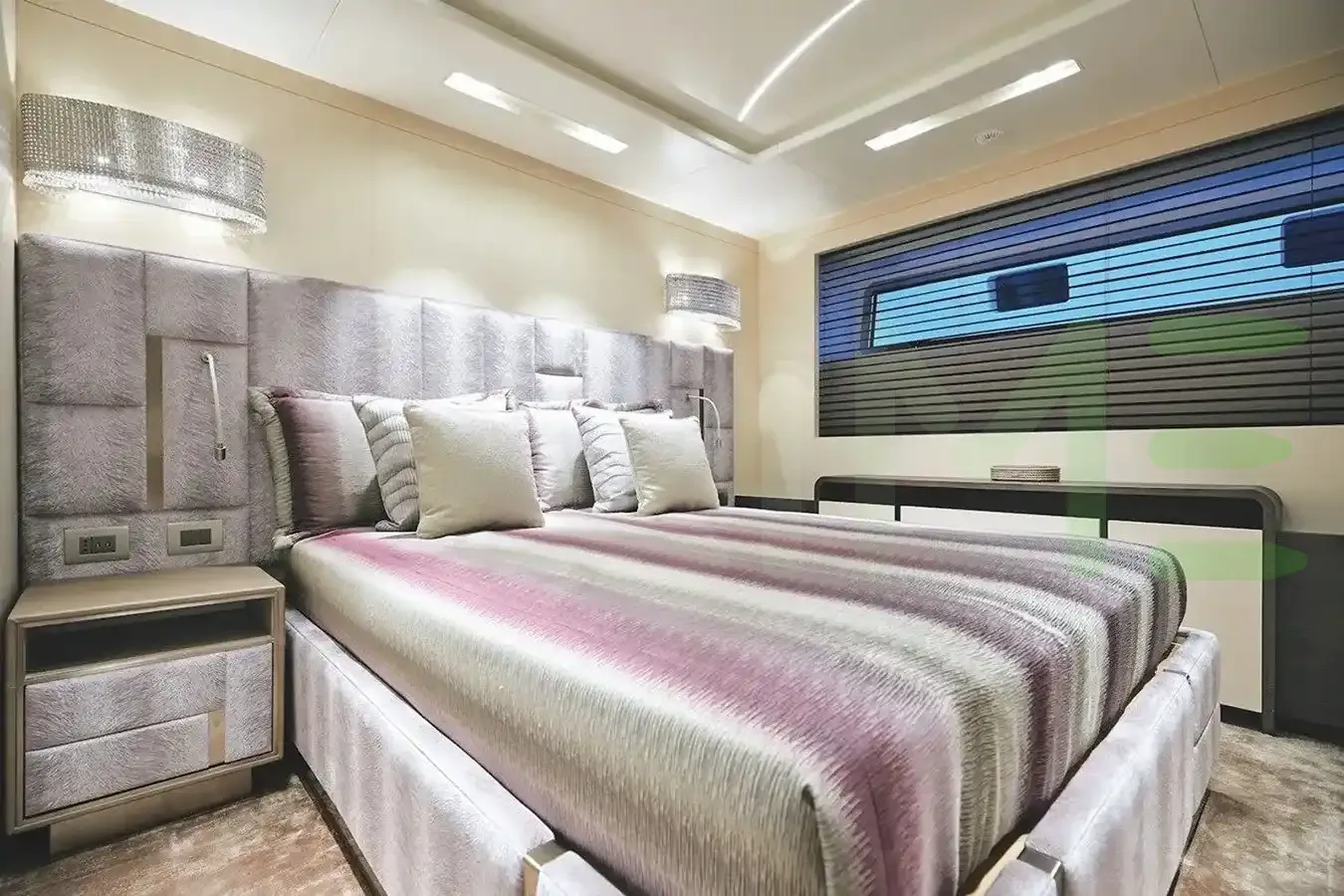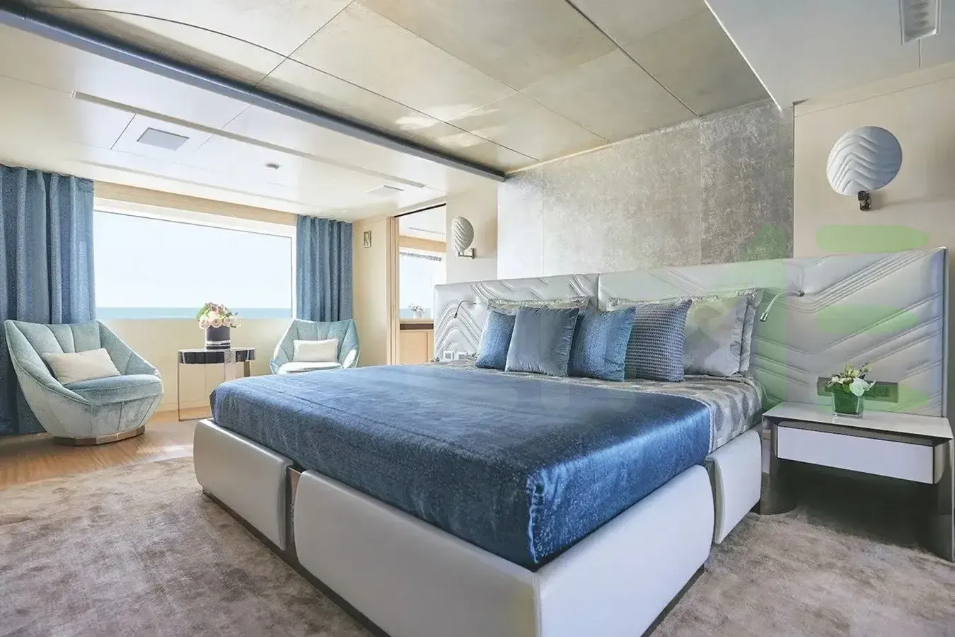 Her features include separate crew passageway, steam room, beauty salon, elevator, beach club, gym, WiFi and air conditioning.