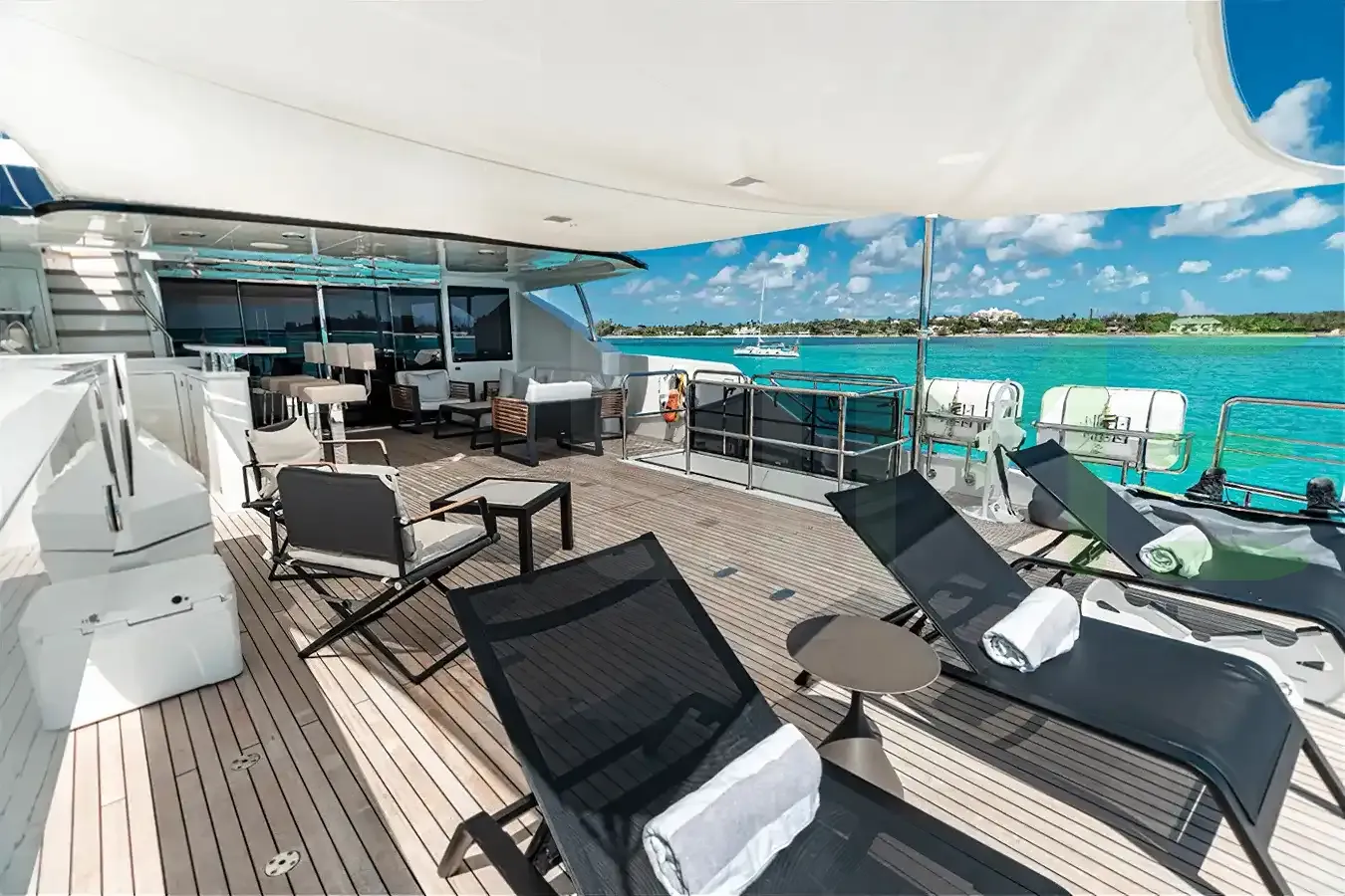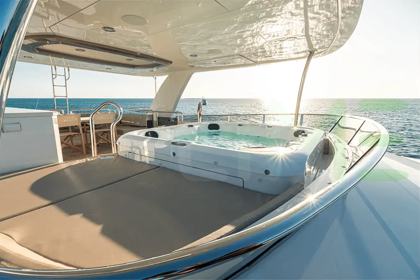 On your charter, you'll find plenty to keep you busy and entertained, notably a beach club for you to relax on the edge of the water. Sit back with a glass of champagne in the deck jacuzzi.