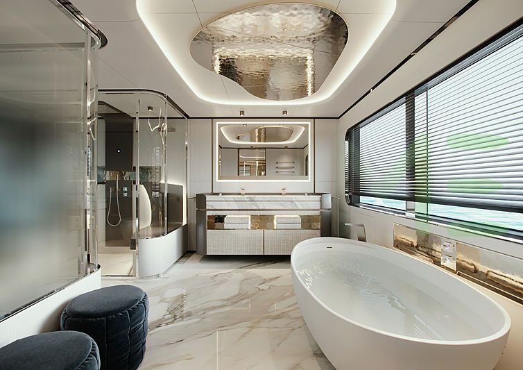 IVAH511 is a full-displacement oceangoing mono-hull motoryacht, with a beam of 34' 5" (10.5 meters), offering stability and comfort during blue water open ocean navigation, including near coastal and inland cruising. Her full-displacement hull shape and draft of 9' 4" (2.85 meters) further contribute to a yacht with a longer range, stowage, and a smooth sailing experience, making her ideal for extended journeys and global travel.