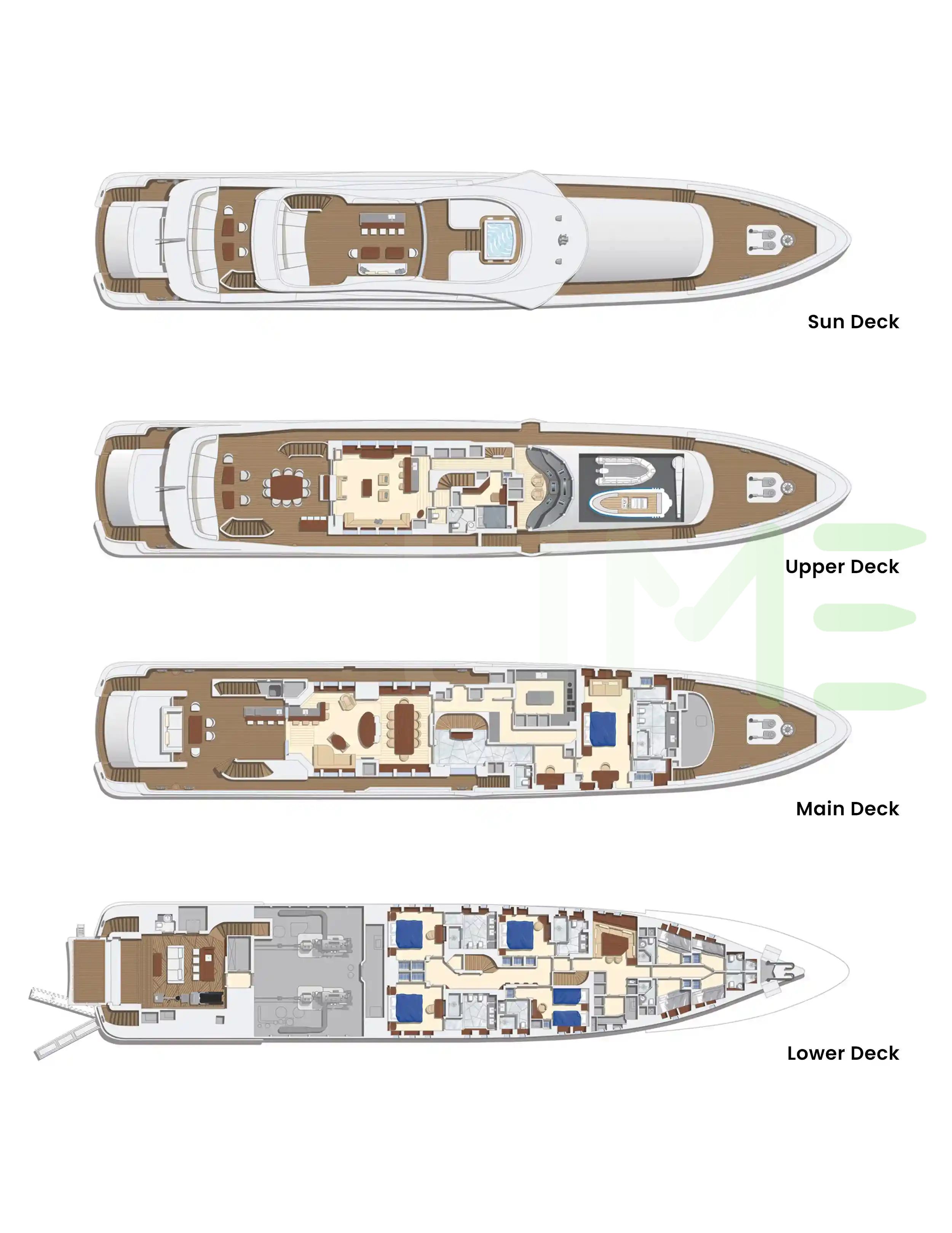 Request plans that include the layout of staterooms, guest areas, and outdoor spaces, as well as crew quarters and work areas.
