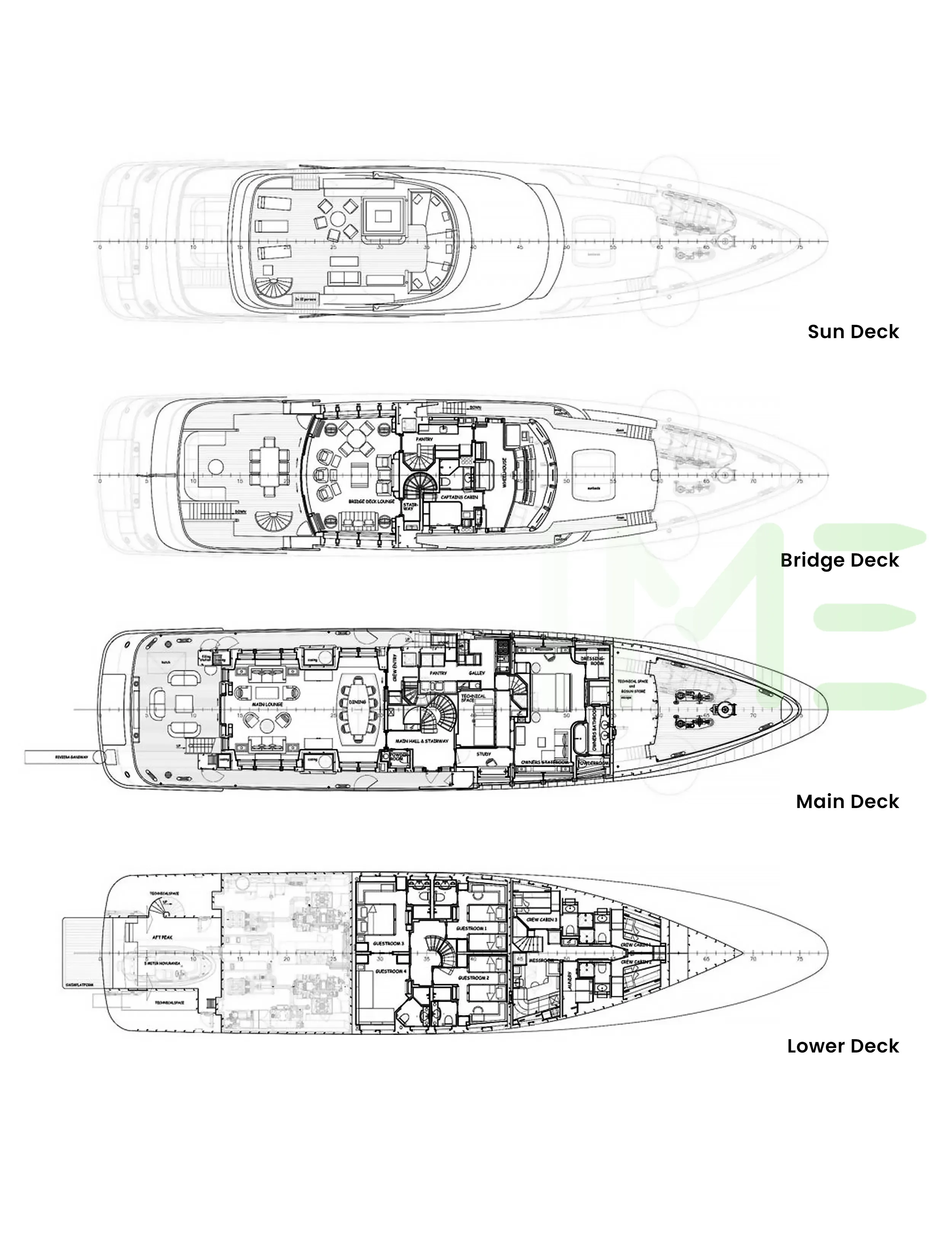 Request plans that include the layout of staterooms, guest areas, and outdoor spaces, as well as crew quarters and work areas.