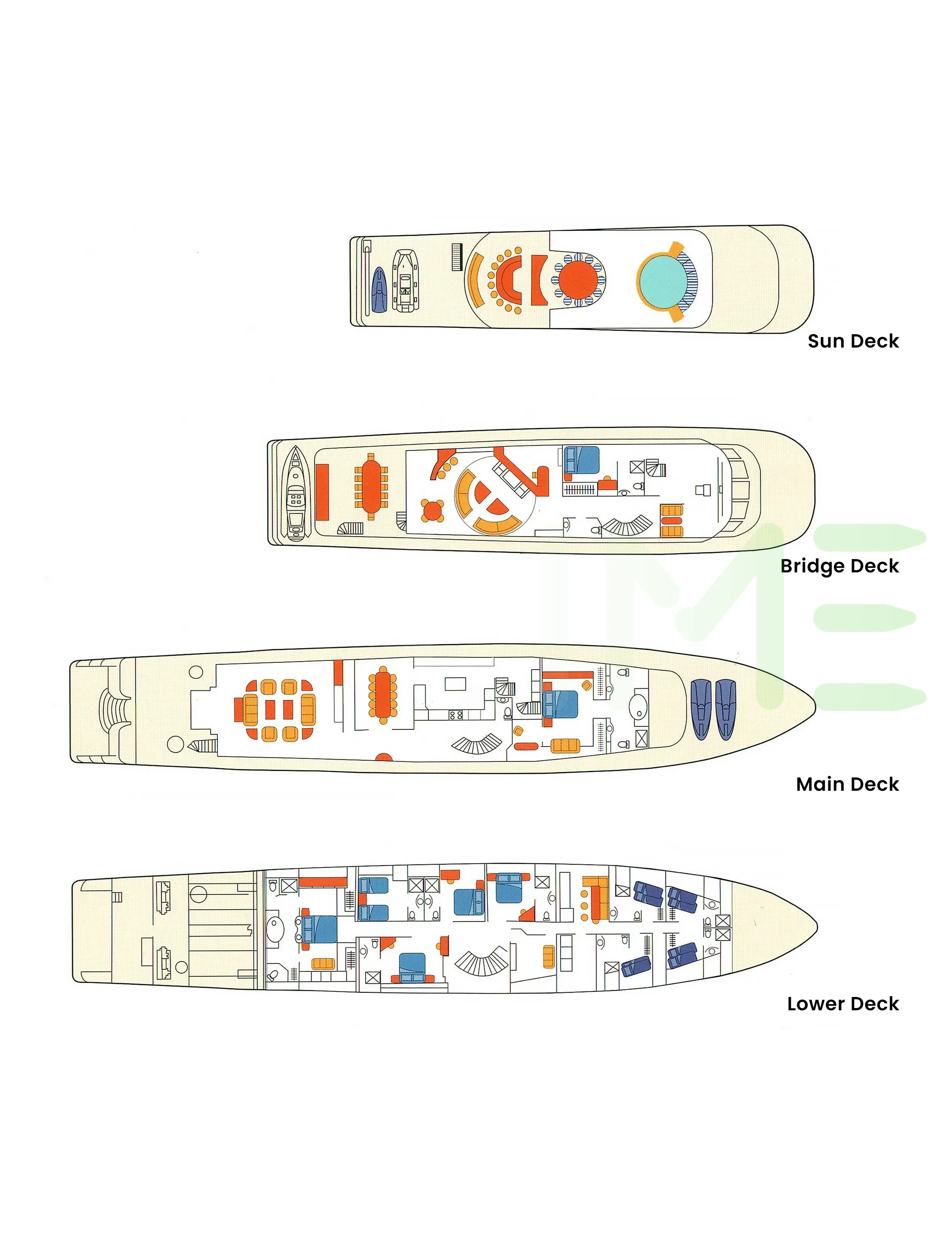 Request plans that include the layout of staterooms, guest areas, and outdoor spaces, as well as crew quarters and work areas.