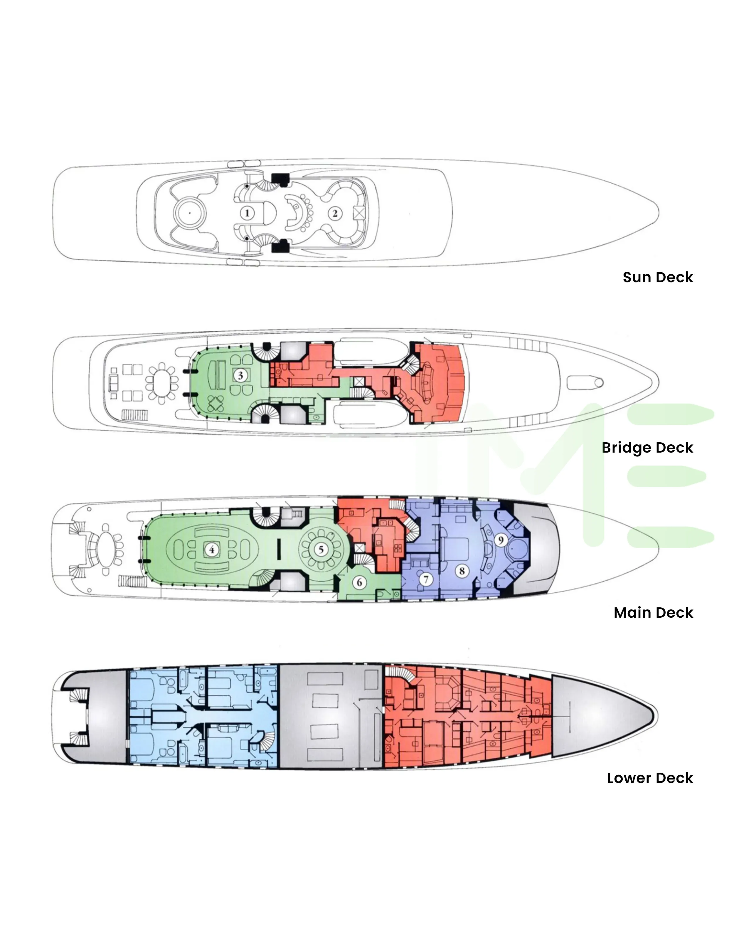 Request plans that include the layout of staterooms, guest areas, and outdoor spaces, as well as crew quarters and work areas.