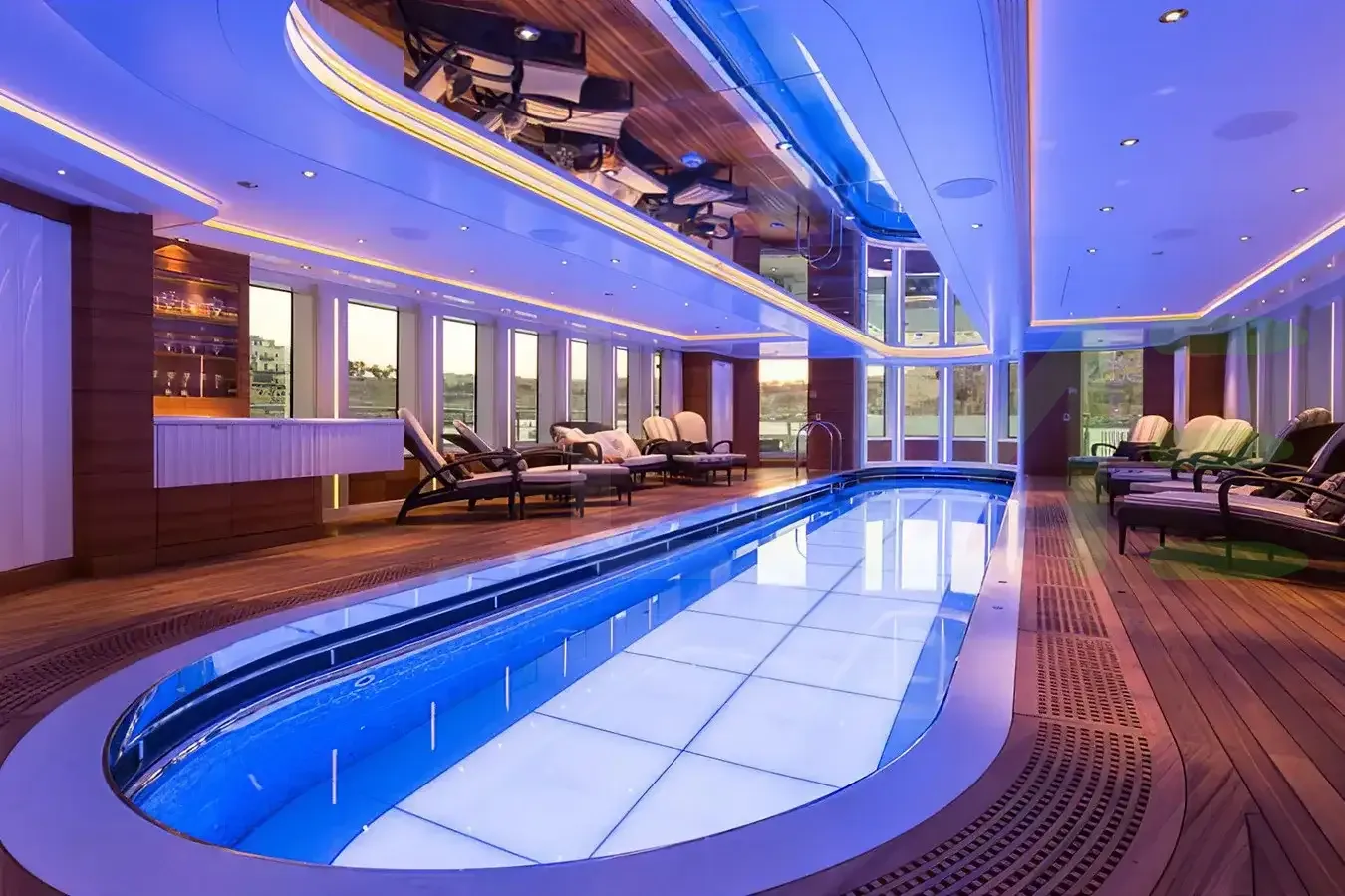 Her features include a dancefloor, beauty salon, elevator, gym and air conditioning.