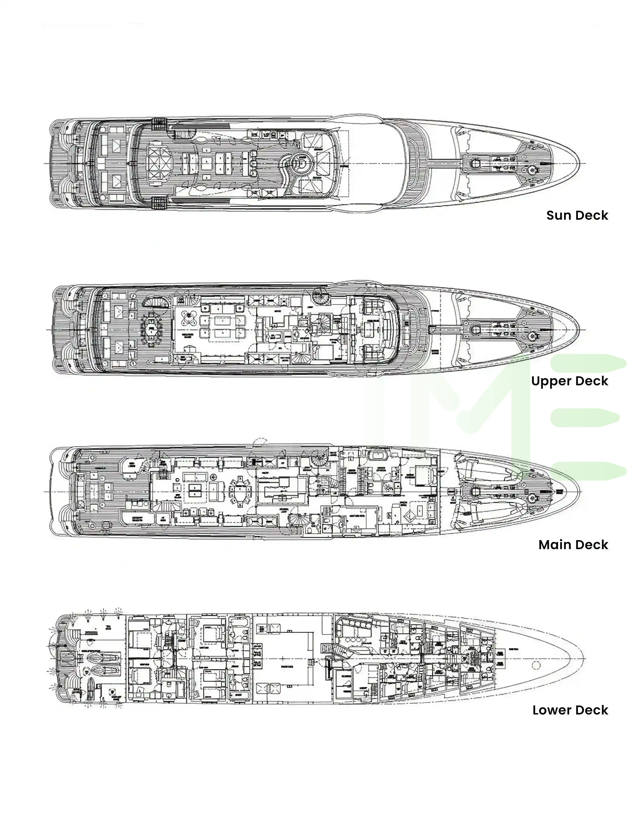 Request plans that include the layout of staterooms, guest areas, and outdoor spaces, as well as crew quarters and work areas.