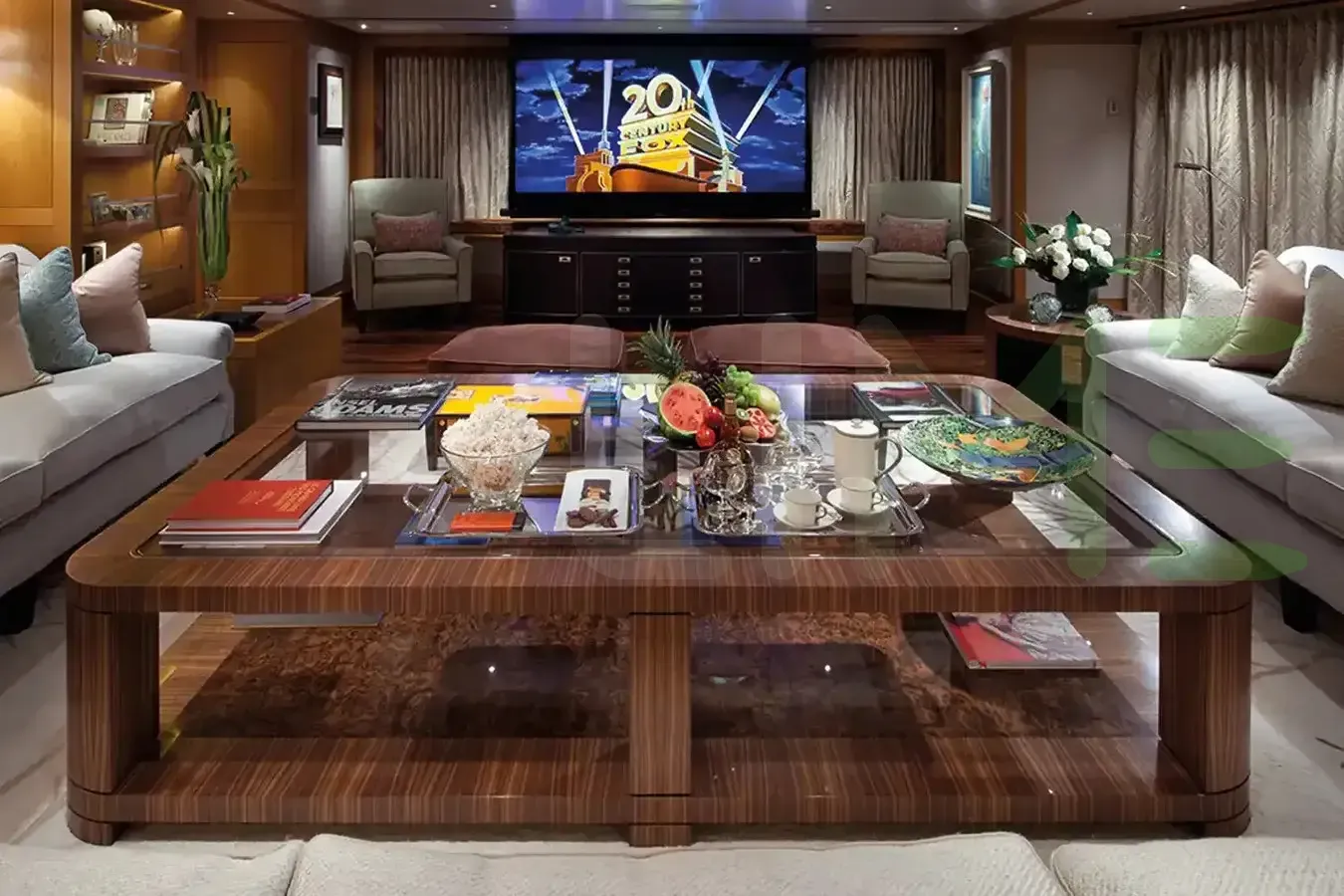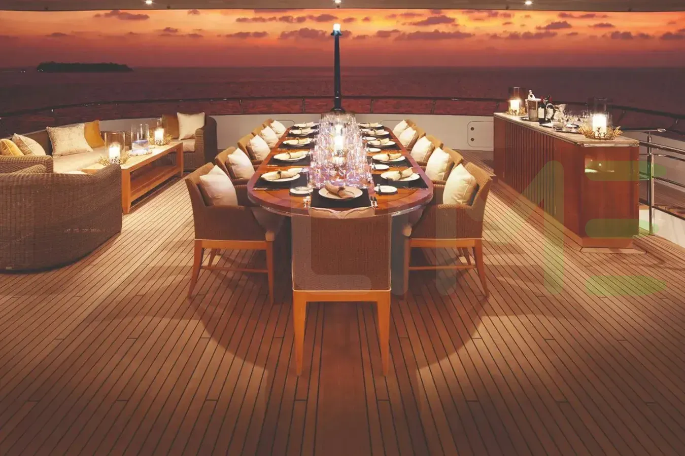Enhanced by her steel full-displacement hull, and aluminium superstructure, a higher level of seaworthiness and comfort for those on board the LADY BRITT yacht has been achieved. The visual appeal of the exterior is complimented by the rich color and distinctive grain patterns of teak decks that lend an air of sophistication to the yacht's appearance.
