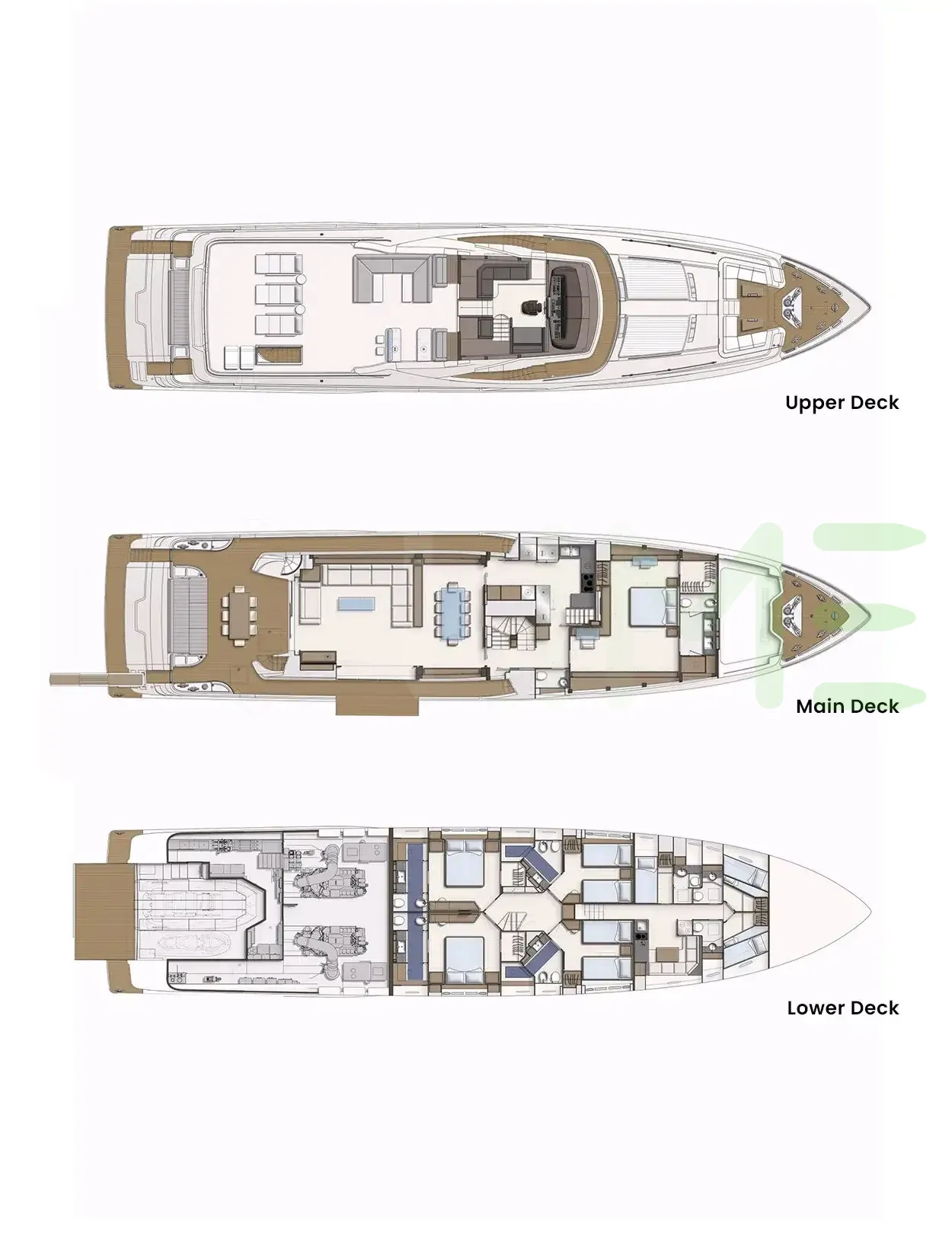 Request plans that include the layout of staterooms, guest areas, and outdoor spaces, as well as crew quarters and work areas.