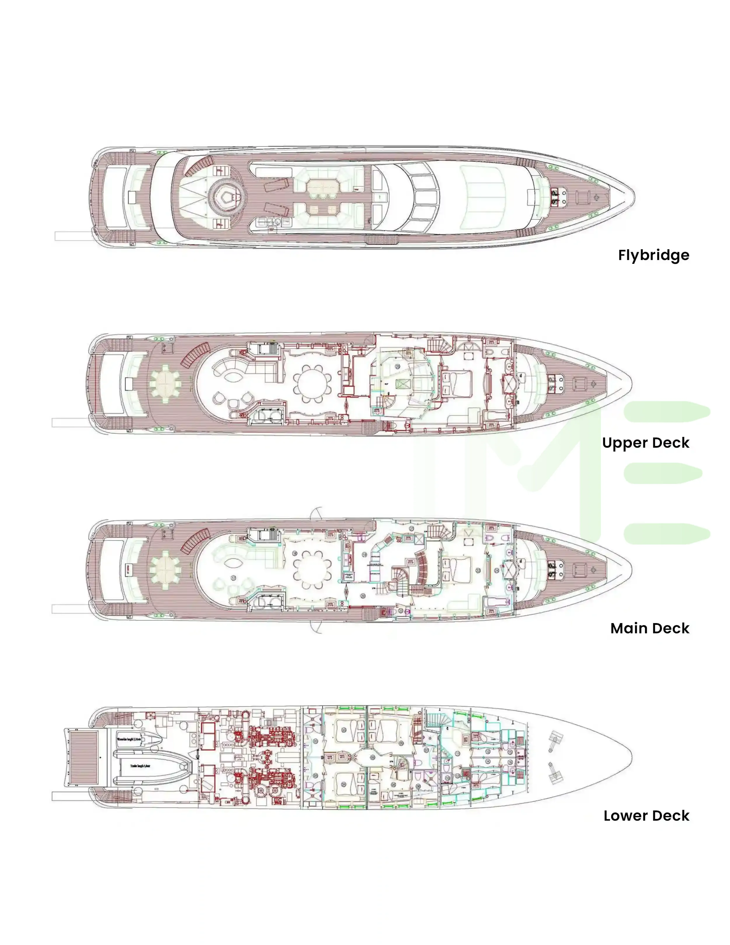 Request plans that include the layout of staterooms, guest areas, and outdoor spaces, as well as crew quarters and work areas.