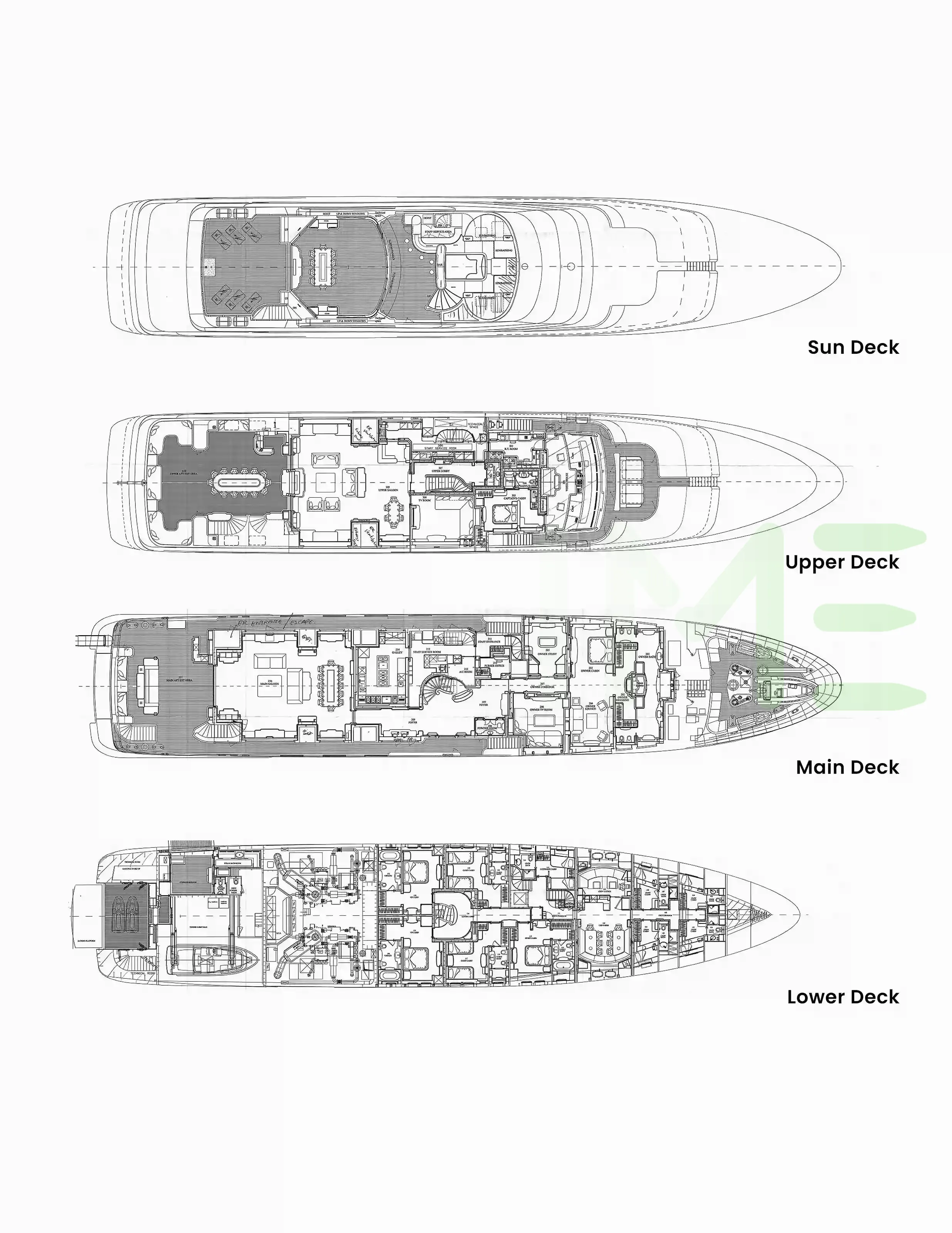 Request plans that include the layout of staterooms, guest areas, and outdoor spaces, as well as crew quarters and work areas.
