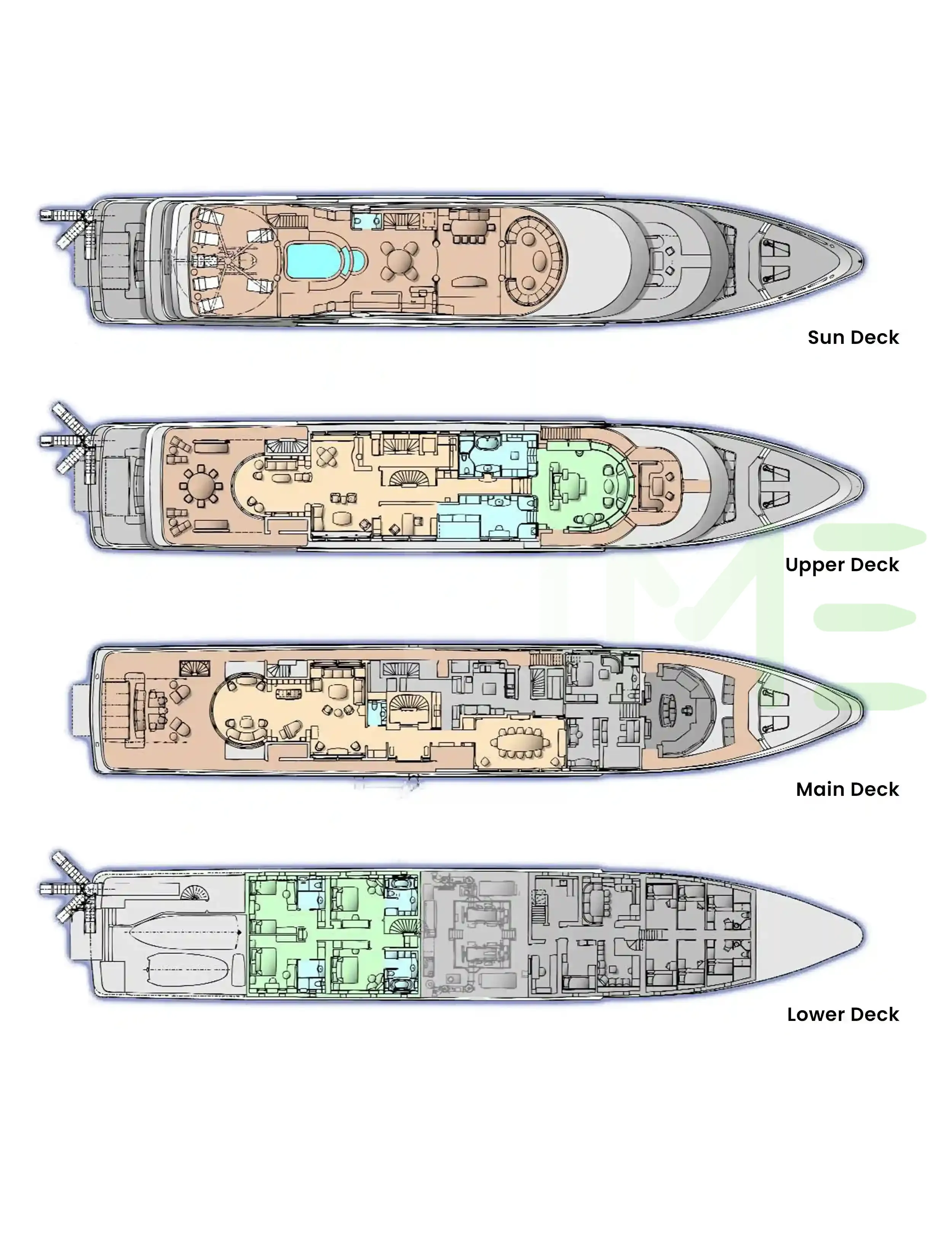 Request plans that include the layout of staterooms, guest areas, and outdoor spaces, as well as crew quarters and work areas.