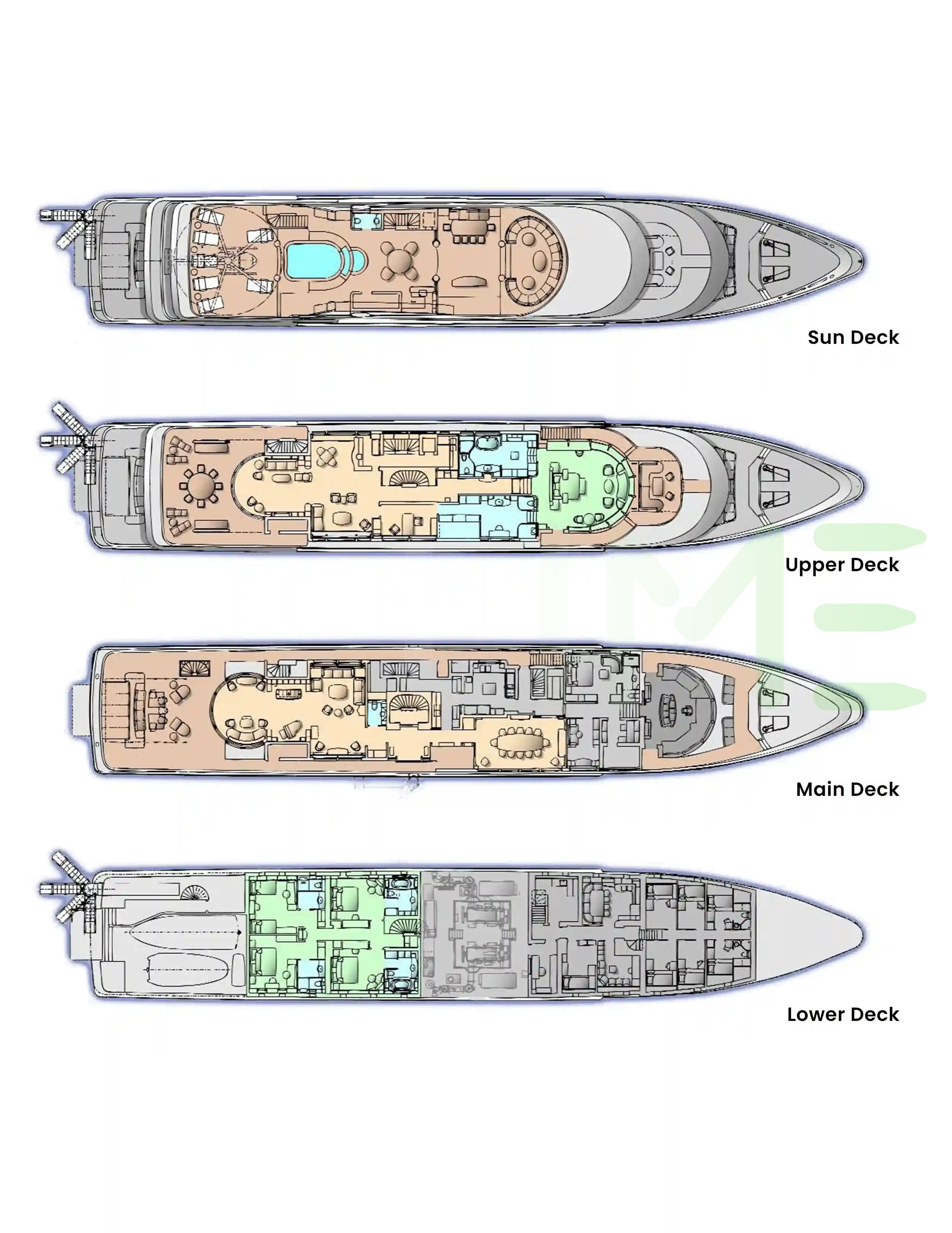 Request plans that include the layout of staterooms, guest areas, and outdoor spaces, as well as crew quarters and work areas.
