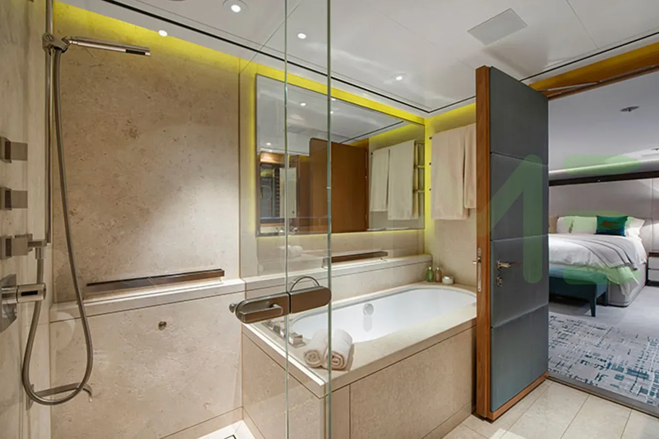 Her features include a spa, sauna, elevator, underwater lights, beach club, gym, deck jacuzzi, WiFi and air conditioning.